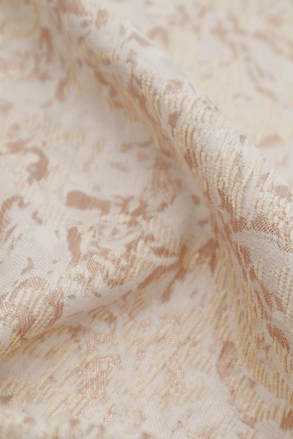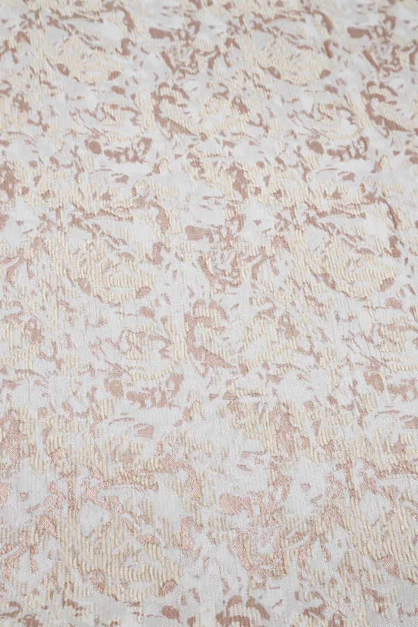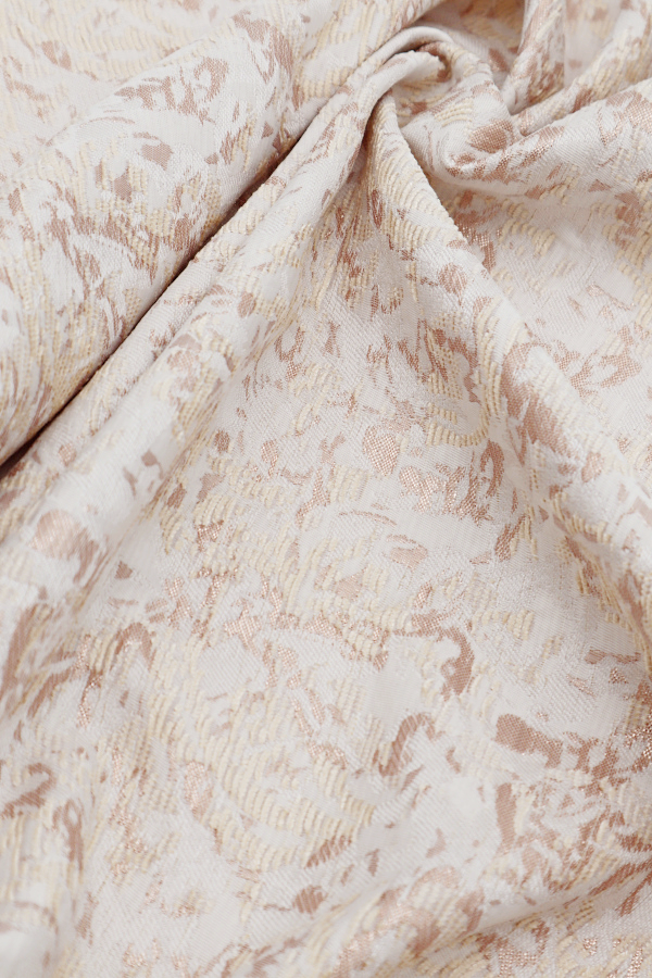 Tecido leve, com padrão, relevo e brilho. Arma e é maleável. |