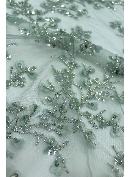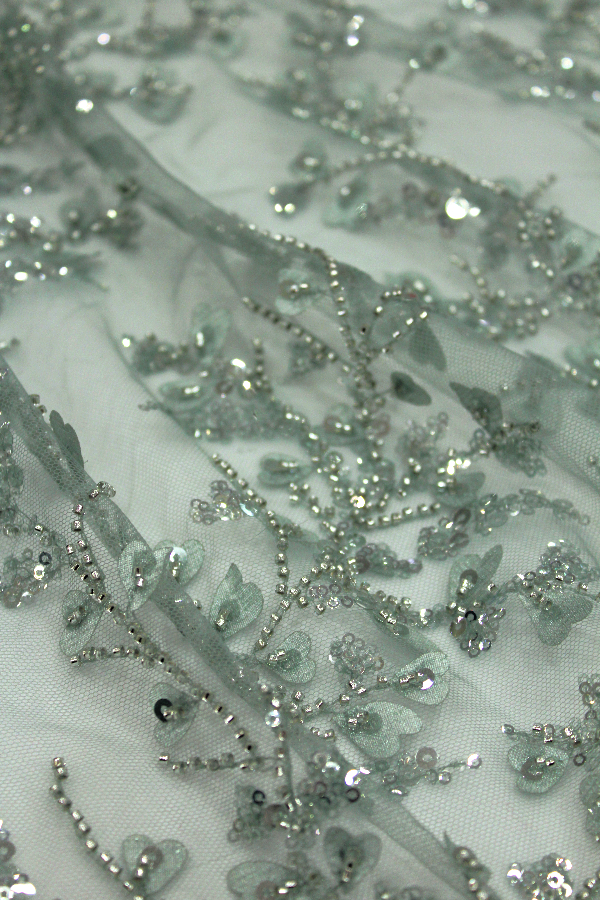 Renda do tipo Tule Bordado, com missangas e lantejoulas transparentes e com corações à cor em 3D. Elegante e brilhante, sem remate igual dois lados.