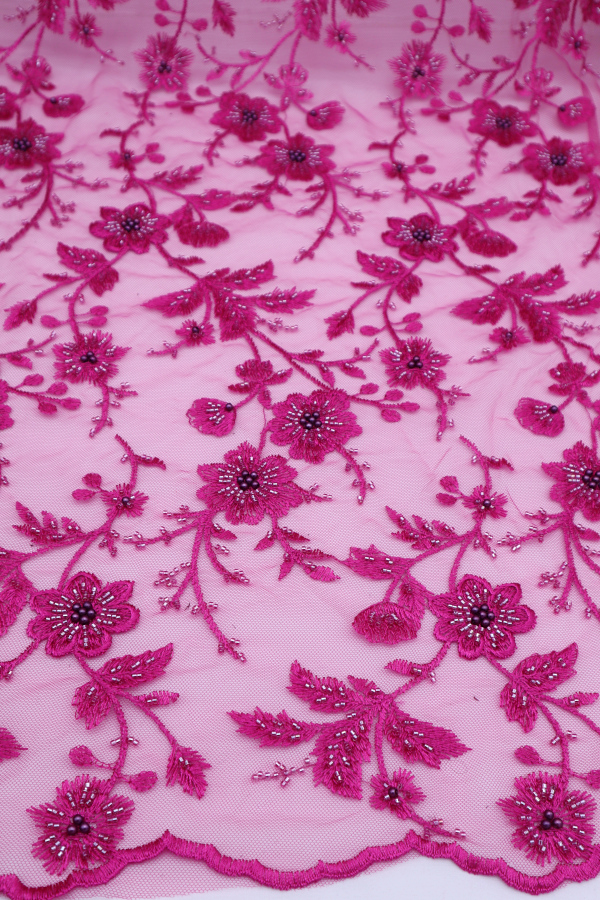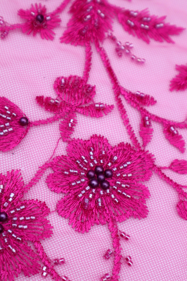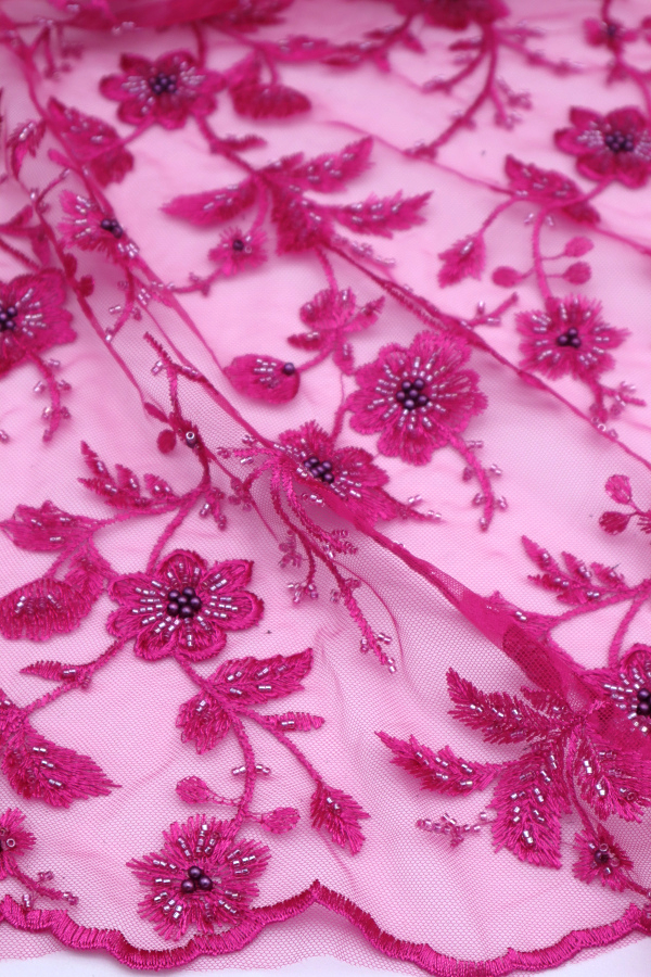 Renda do tipo Tule bordado com missangas e pérolas que formam flores por toda a renda. Com remate nos lados. |