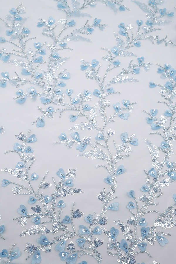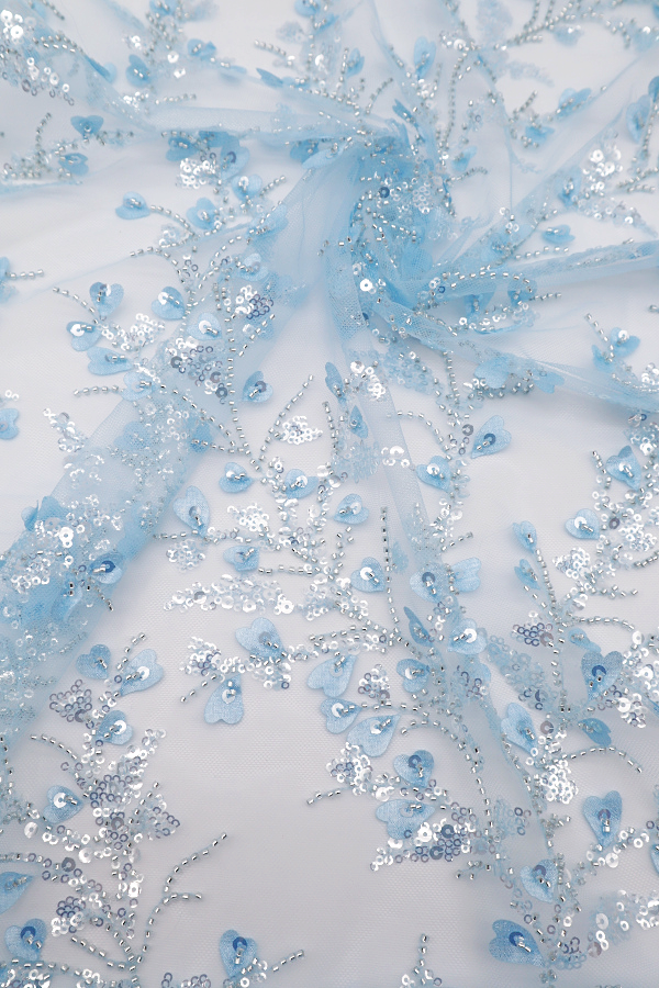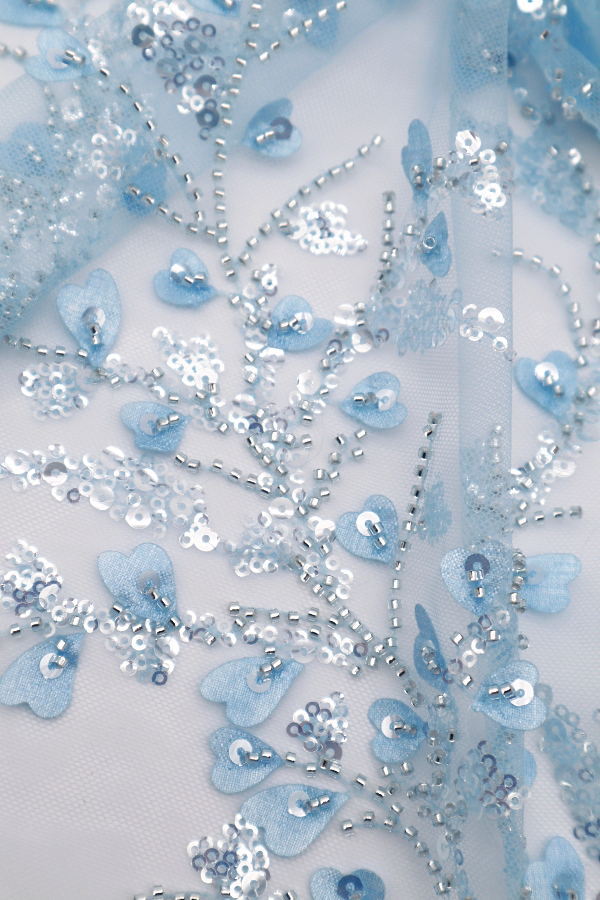 Renda do tipo Tule Bordado, com missangas e lantejoulas transparentes e com corações à cor em 3D. Elegante e brilhante, sem remate igual dois lados. |
