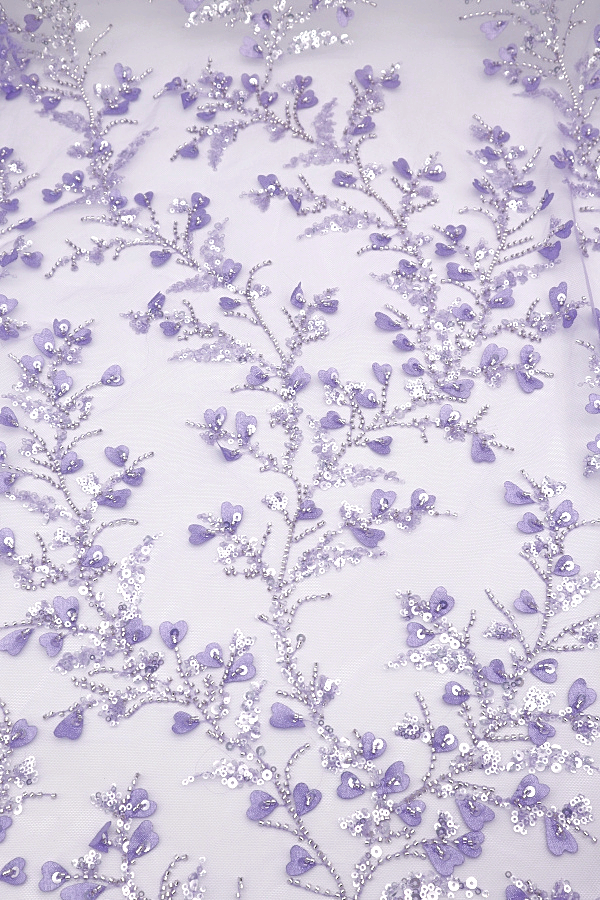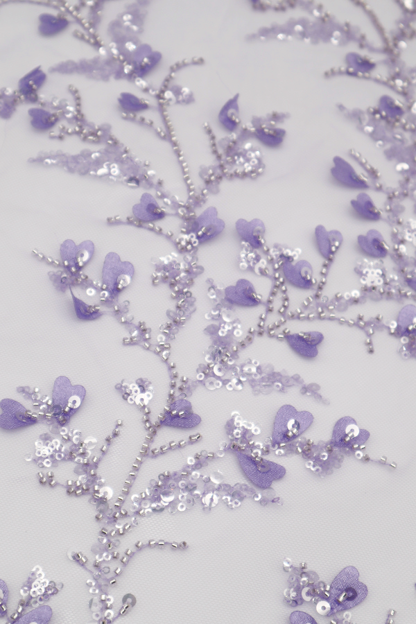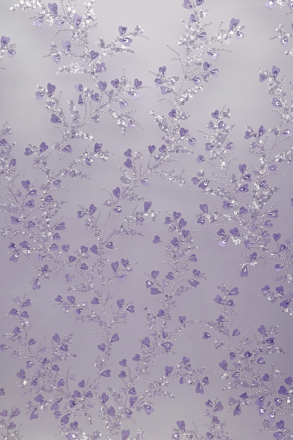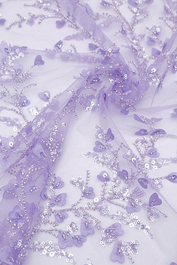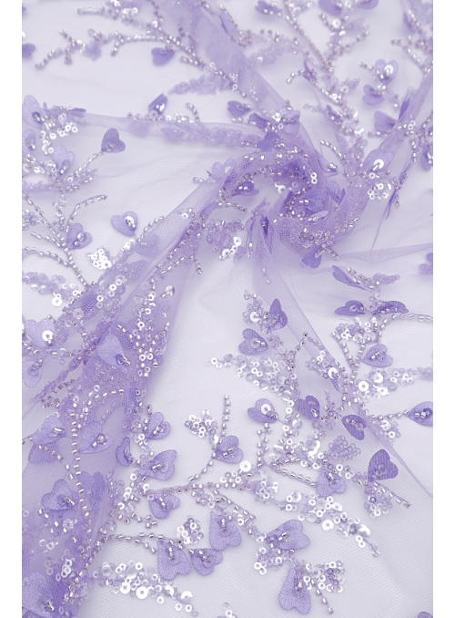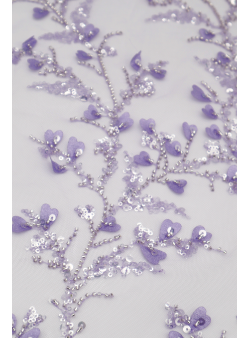 Renda do tipo Tule Bordado, com missangas e lantejoulas transparentes e com corações à cor em 3D. Elegante e brilhante, sem remate igual dois lados. |