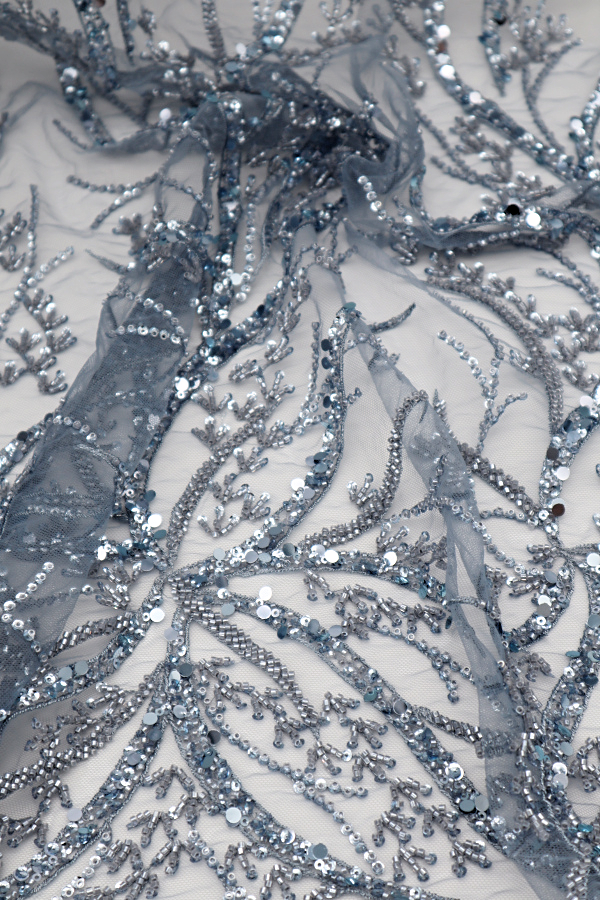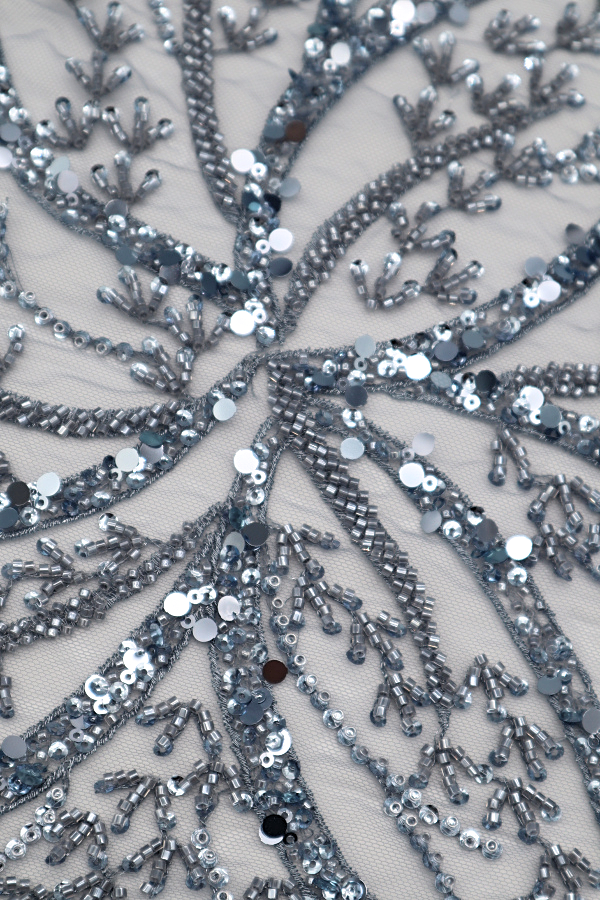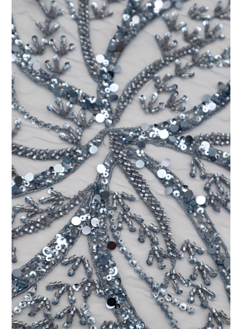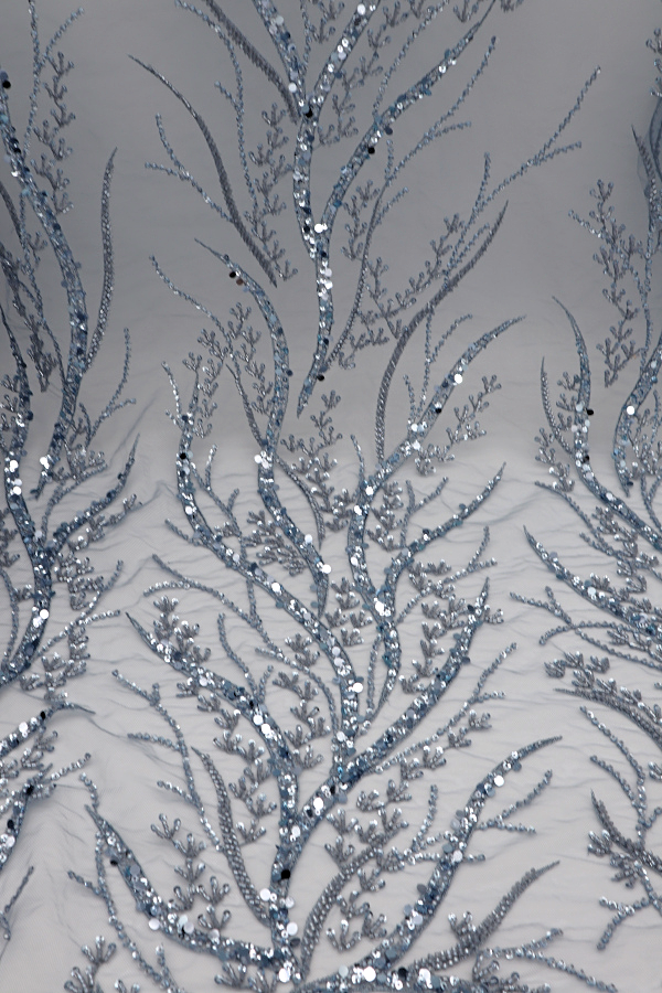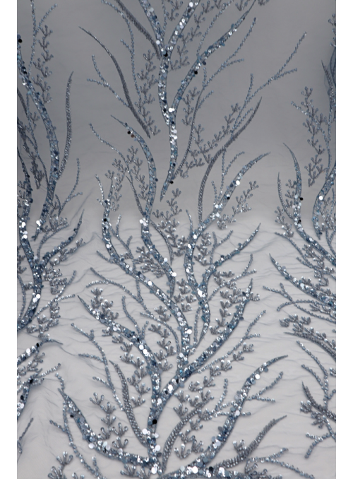 Renda do tipo tule bordado com lantejoulas e missangas aplicadas. Forma rameados por todo o tule, com diferença de preenchimento. Sem remate .