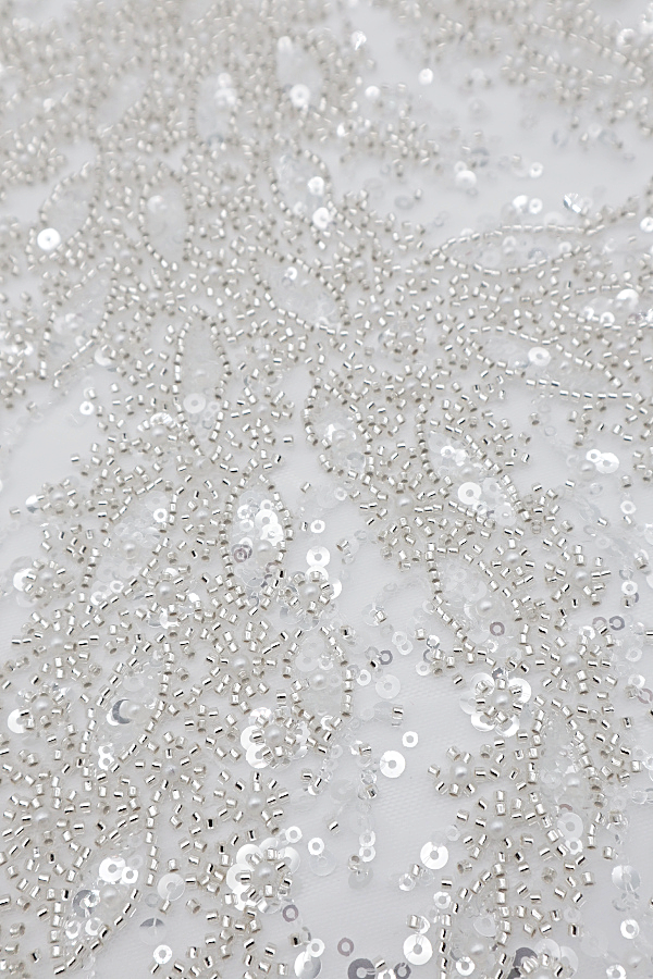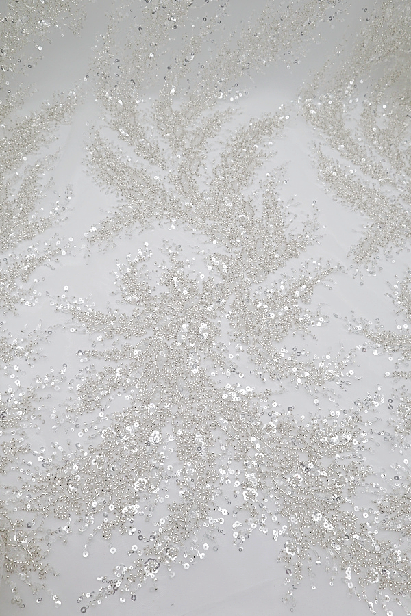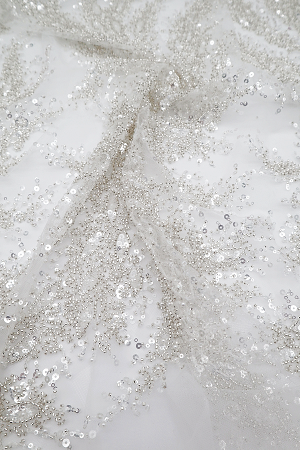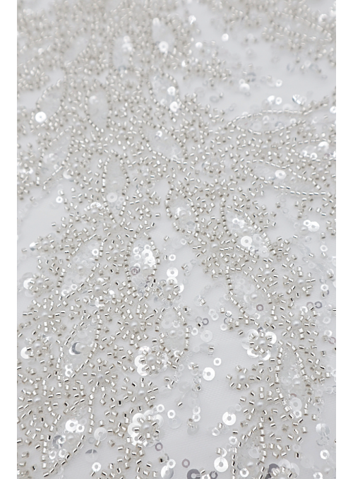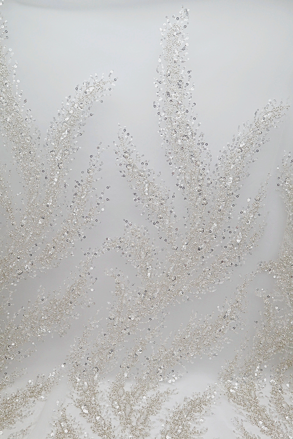 Tul bordado exquisito, con pedrería y lentejuelas. No tiene remate.  |