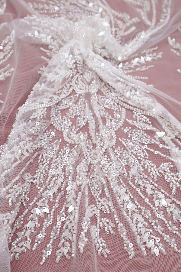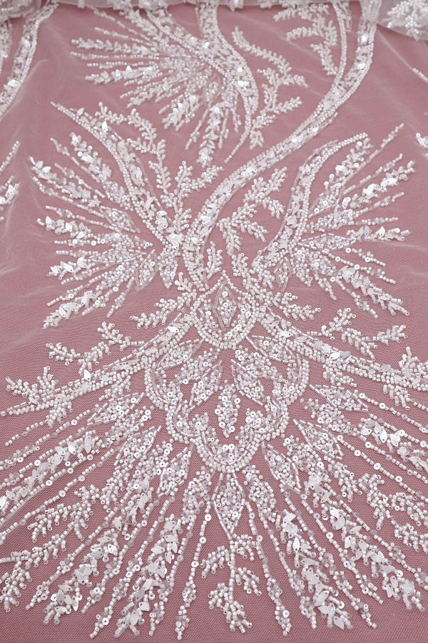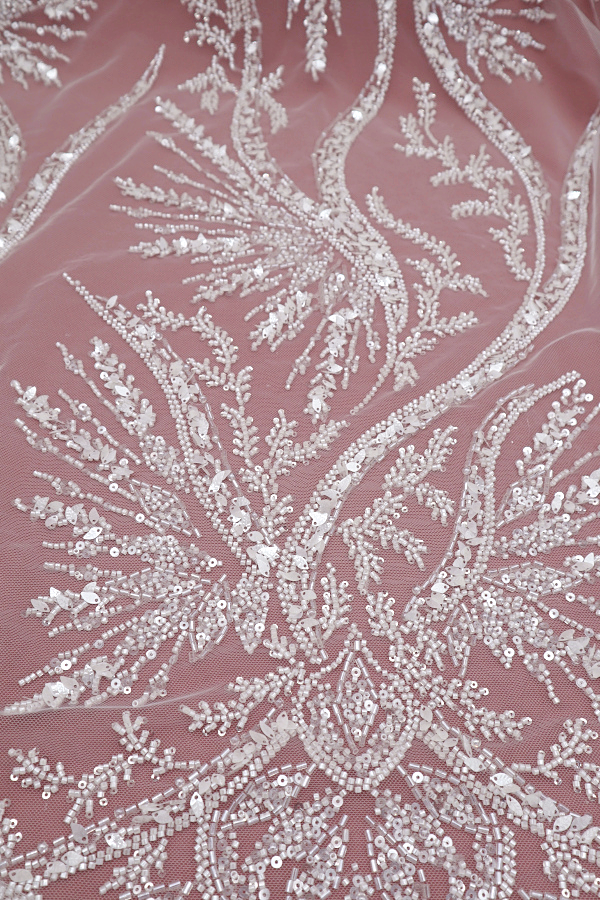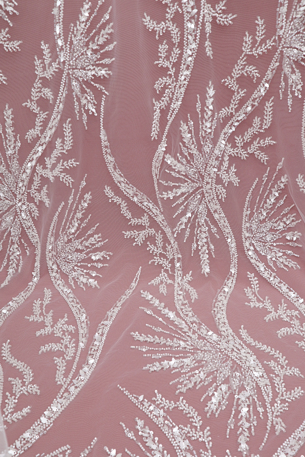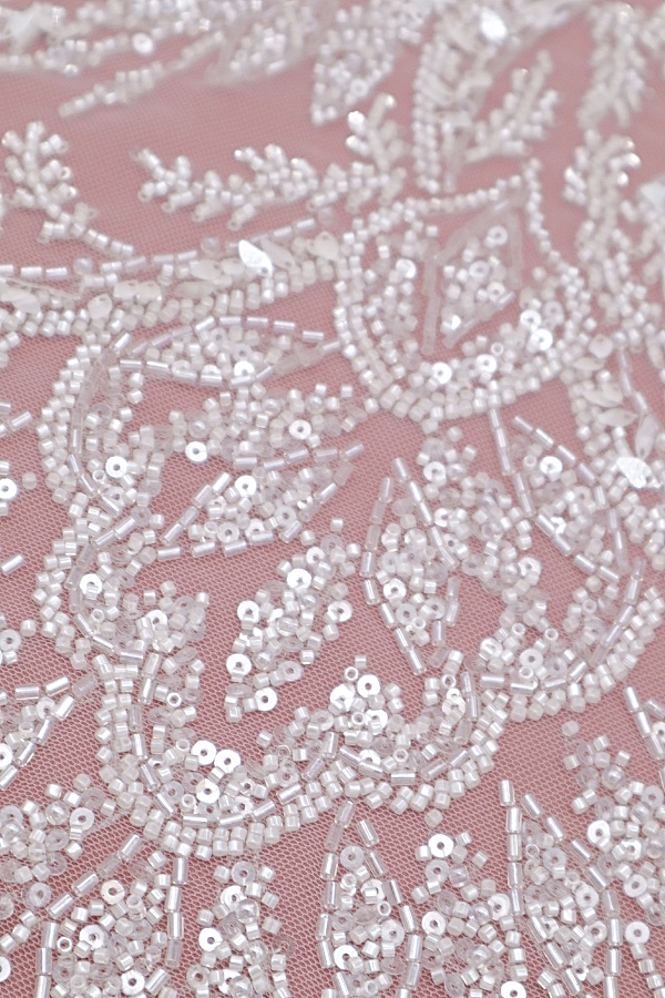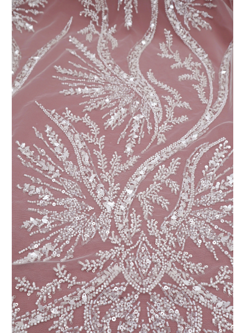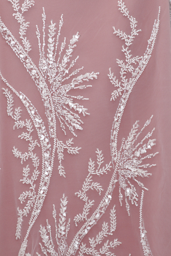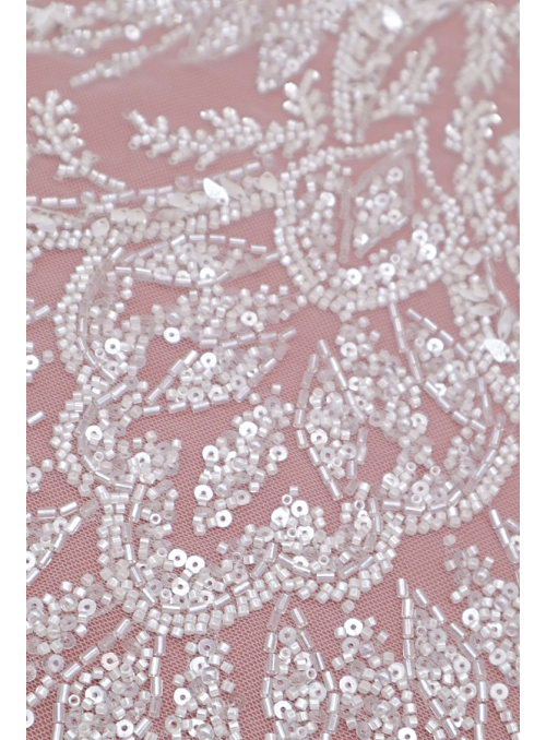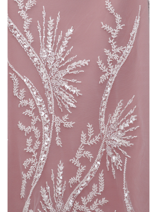 Tul bordado exquisito, con pedrería y lentejuelas. No tiene remate. |