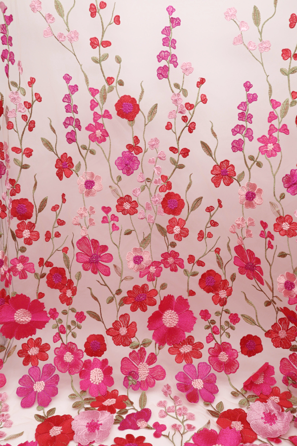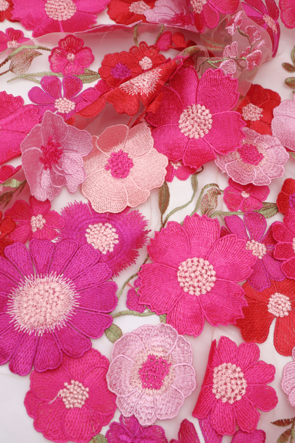 Tule bordado com flores 3D. Não há remate. Faz diferença de preenchimento.