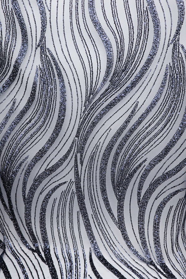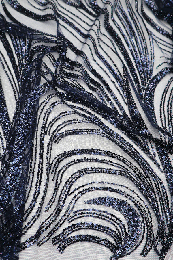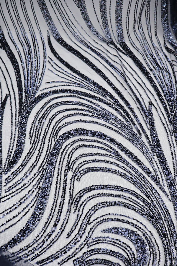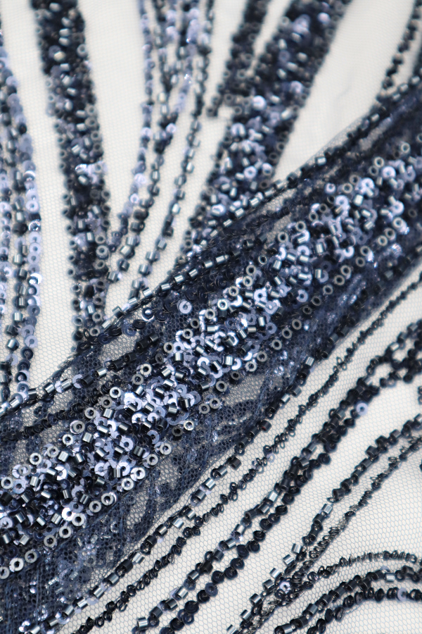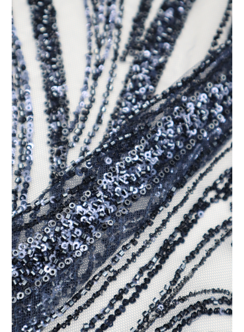 Tule bordado com lantejoulas e missangas. Formam rameados por todo o tecido. Sem remate nos lados.