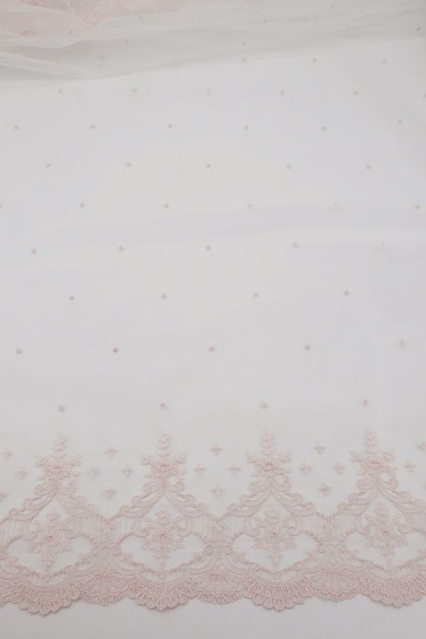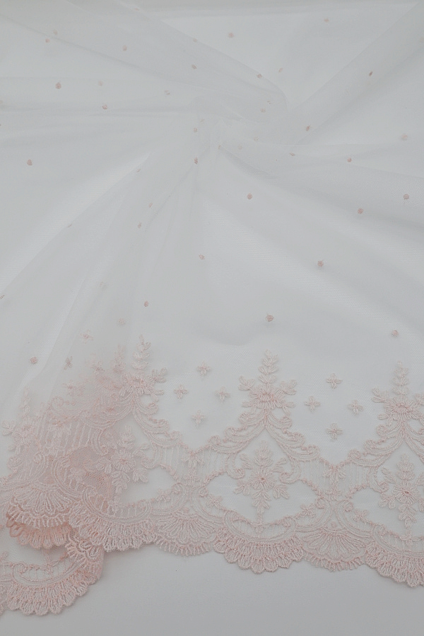 Tule com bordado em algodão, leve, macio e delicado. Os remates são iguais dos dois lados.
