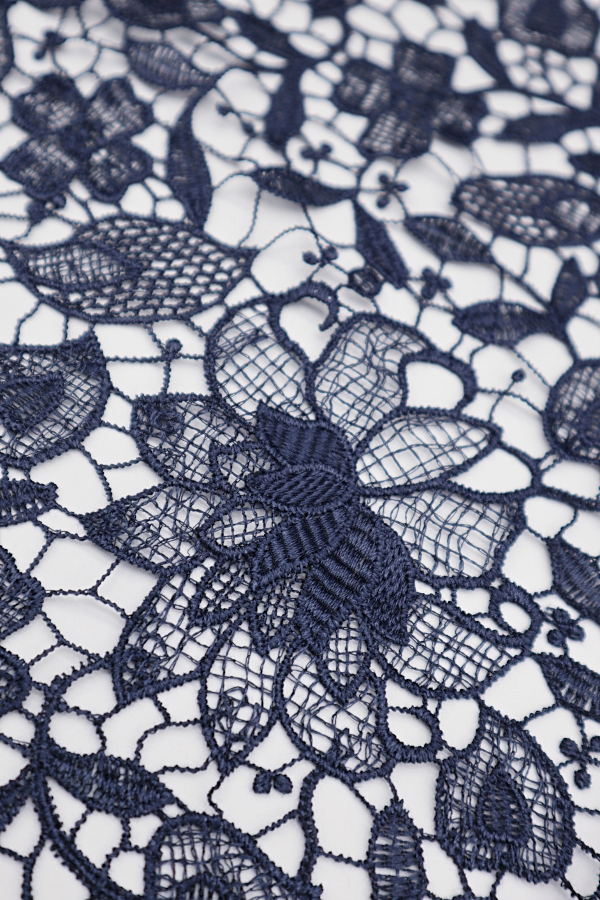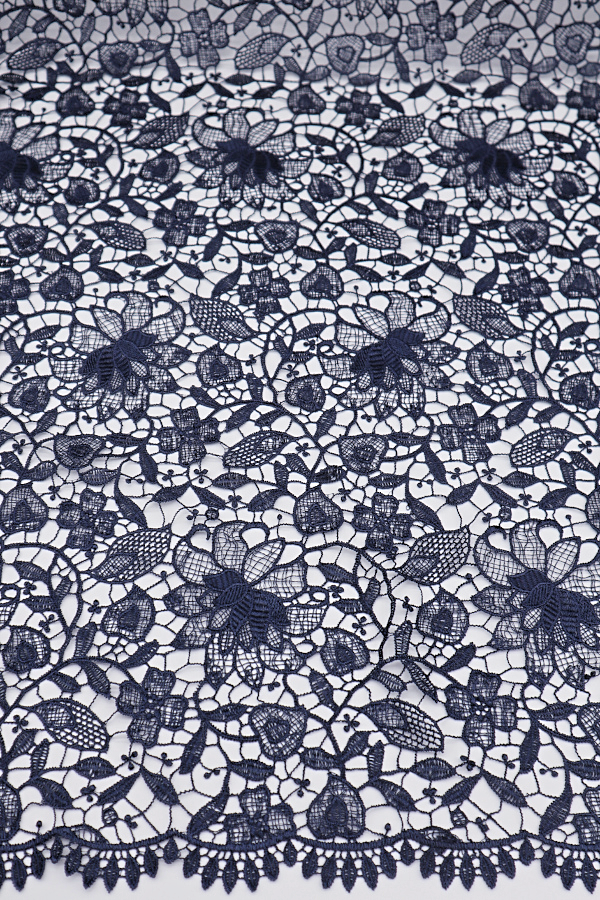 Renda guipure que formam flores por todo o tecido. Com remate dos dois lados. |