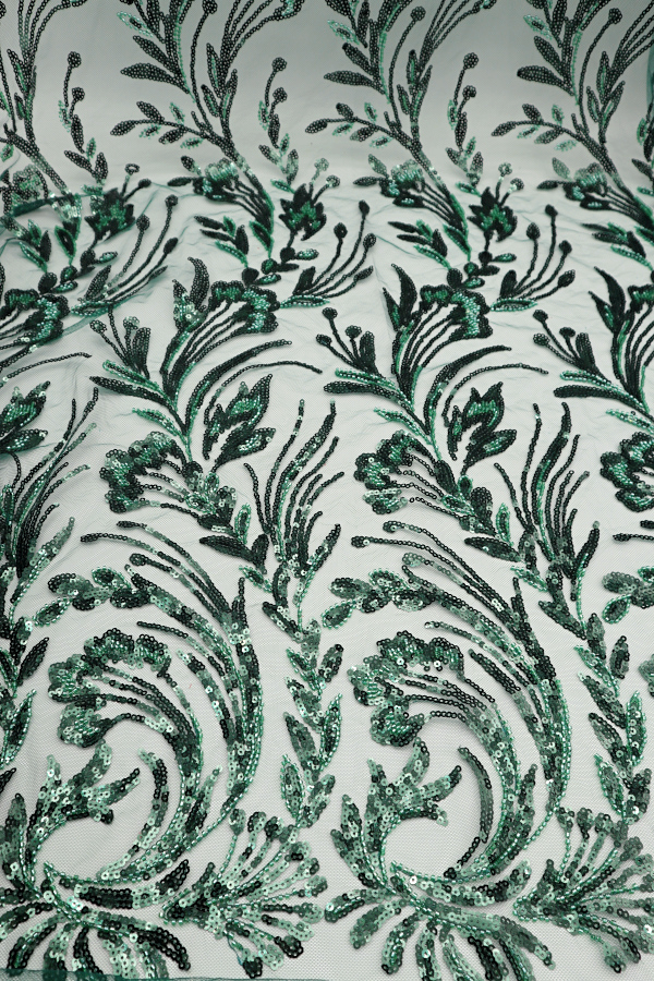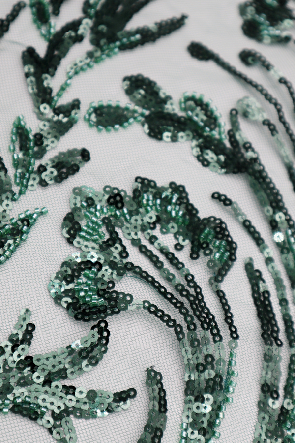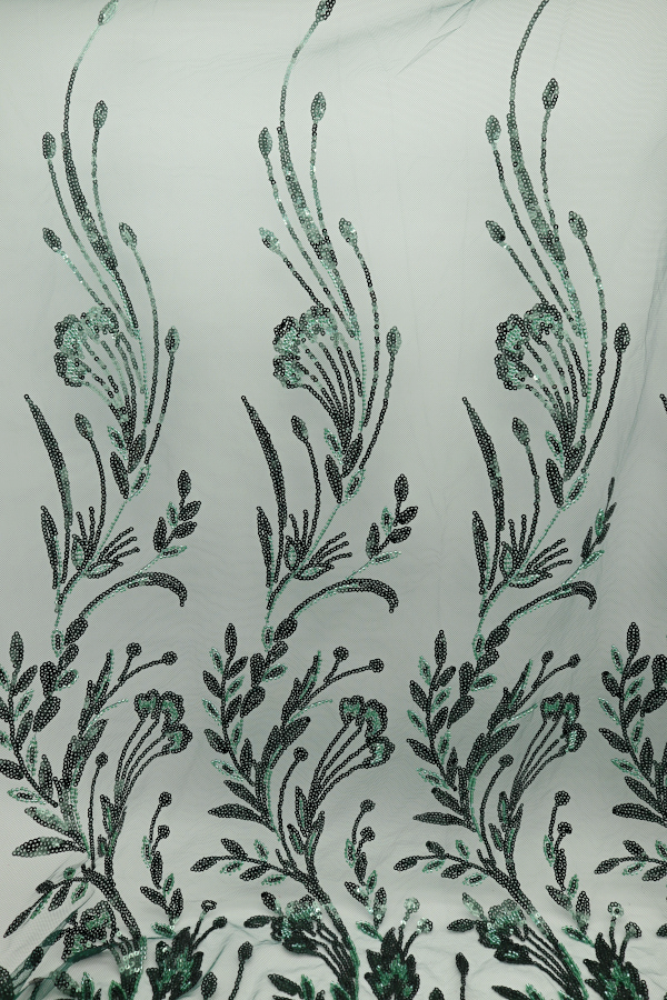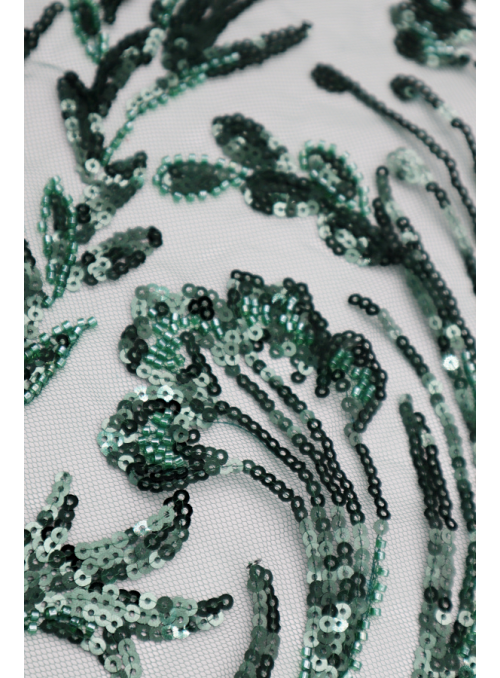 Tule bordado com lantejoulas e missangas. Formam rameados. Sem remate nos lados. |
