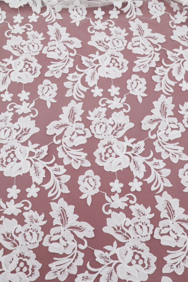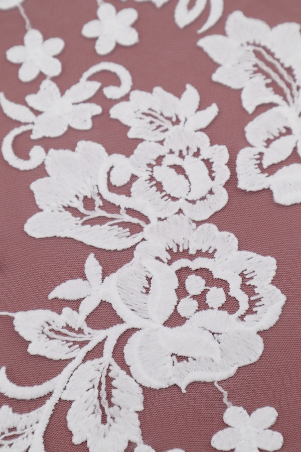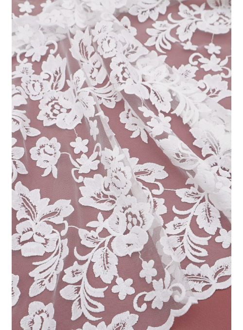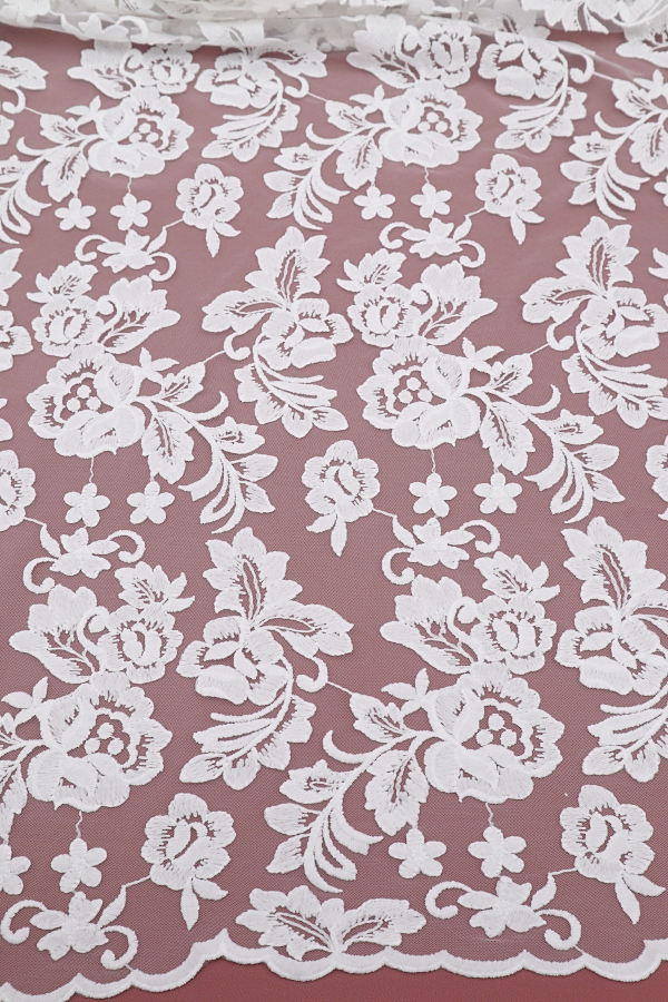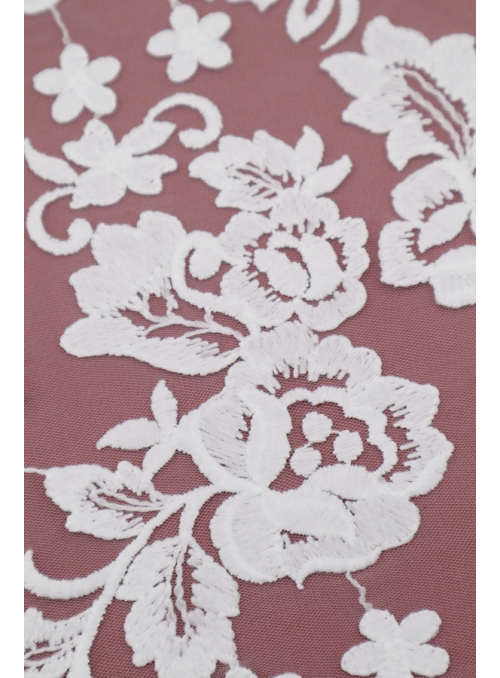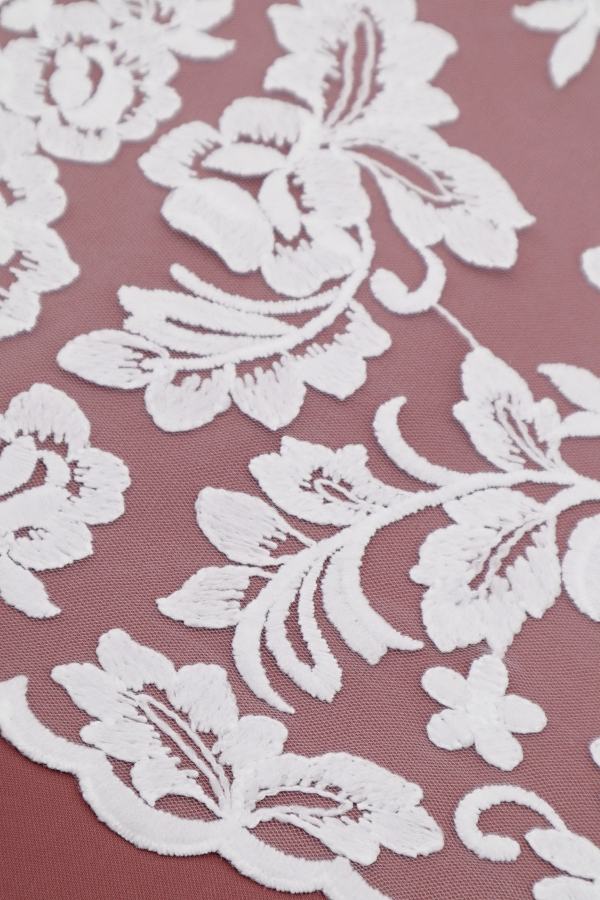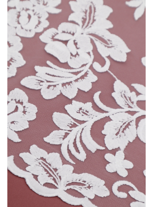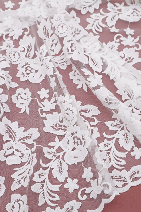 Delicado tul bordado, sin dibujos, con ribete lateral y relleno completo.