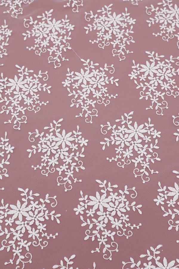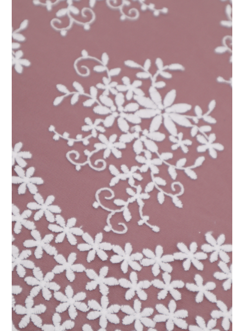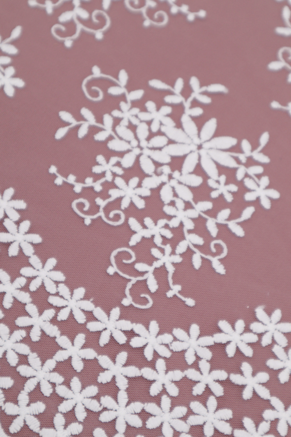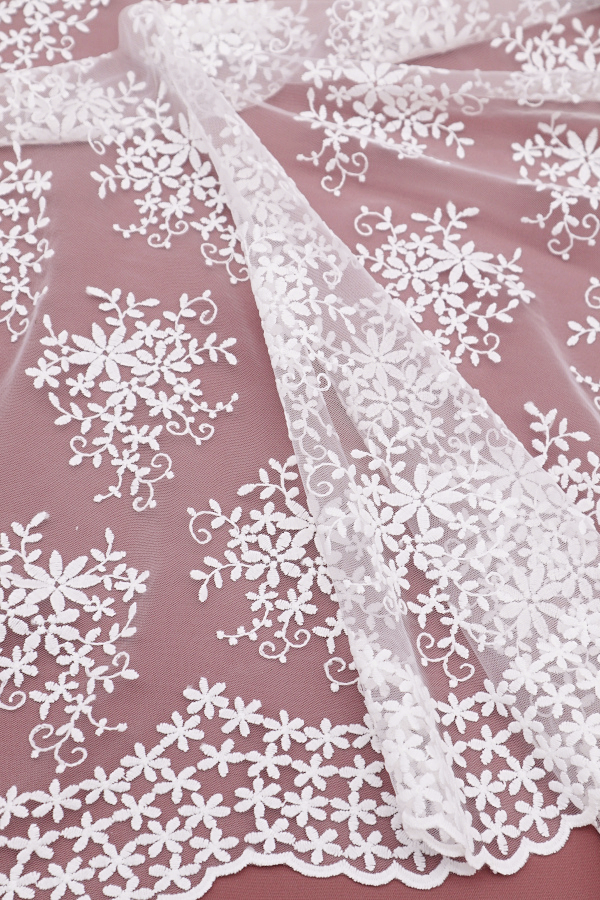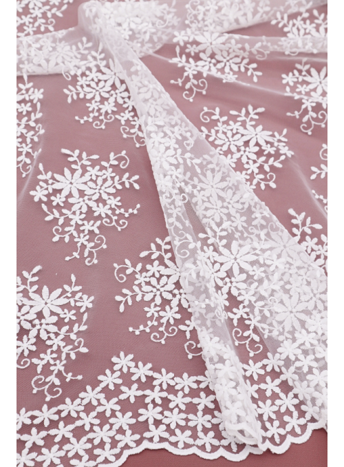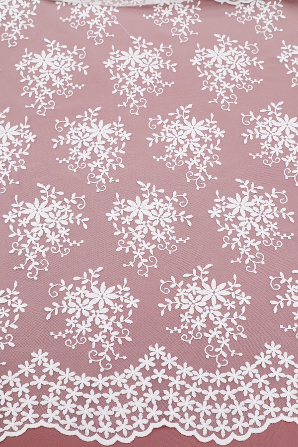 Delicado tul bordado, sin dibujos, con ribete lateral y relleno completo.