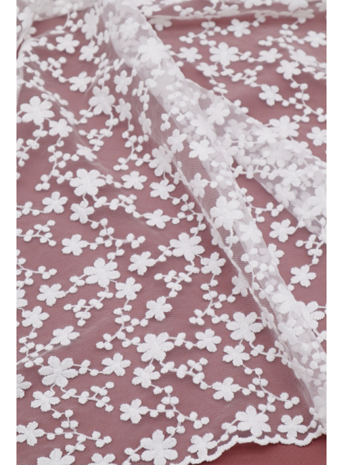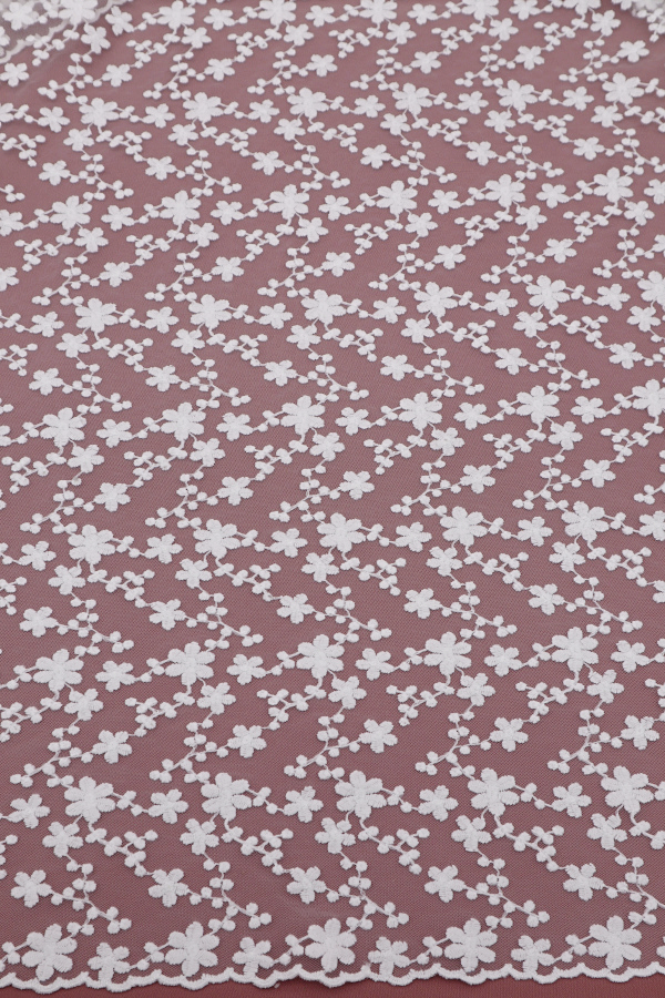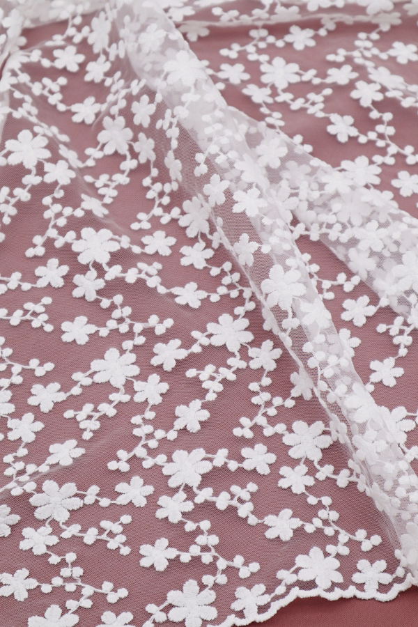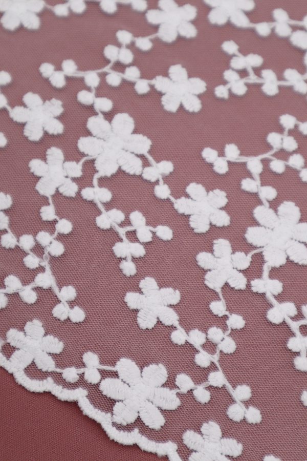 Delicado tul bordado, sin dibujos, con ribete lateral y relleno completo.