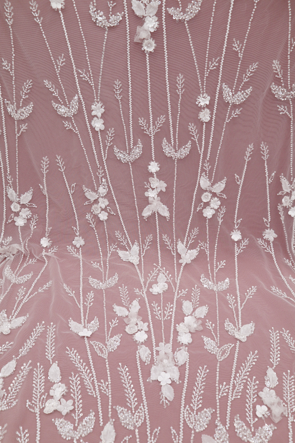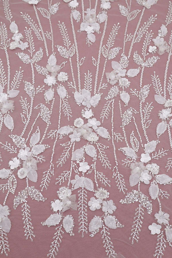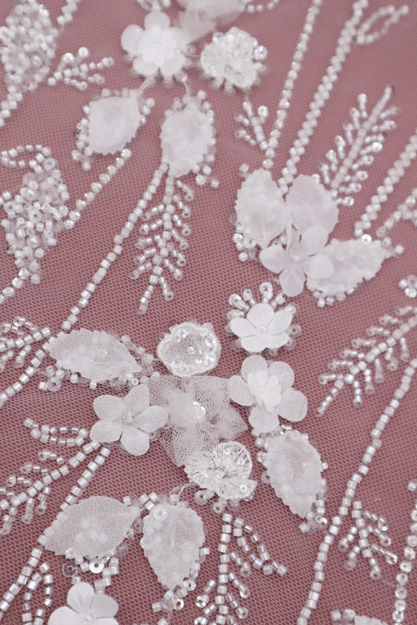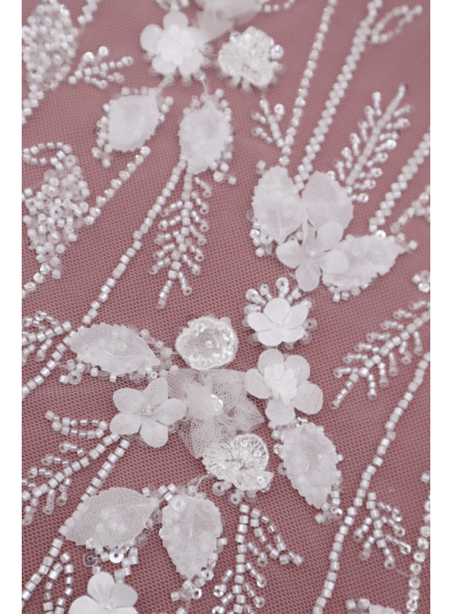 Tul bordado con cuentas, lentejuelas y flores 3D. Sin ribetes laterales. |