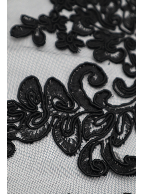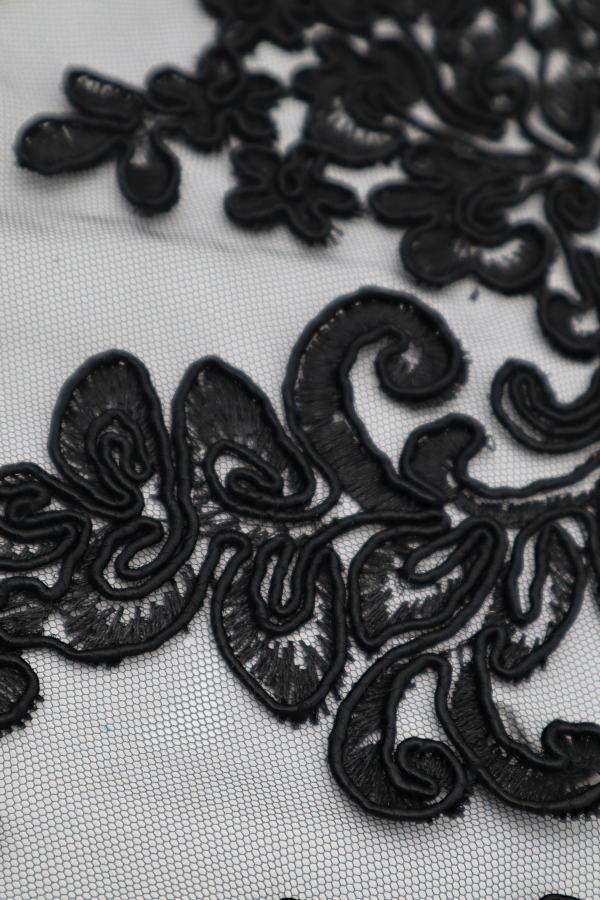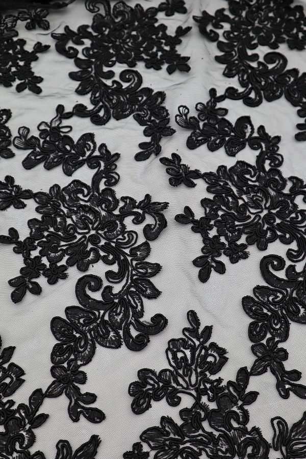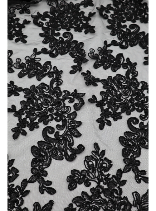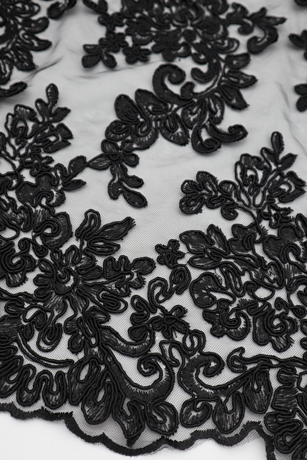 Tul bordado con cordón y sin pedrería. Relleno uniforme en toda la tela y acabado en los bordes. |