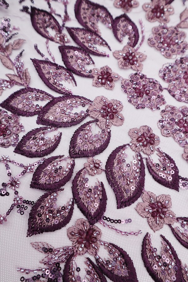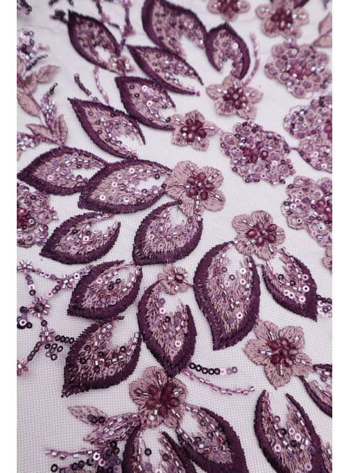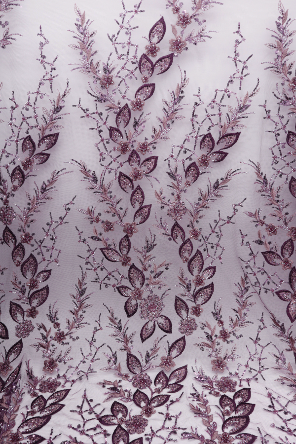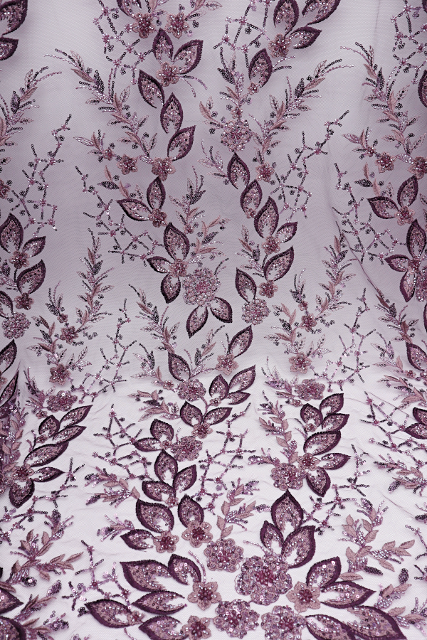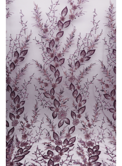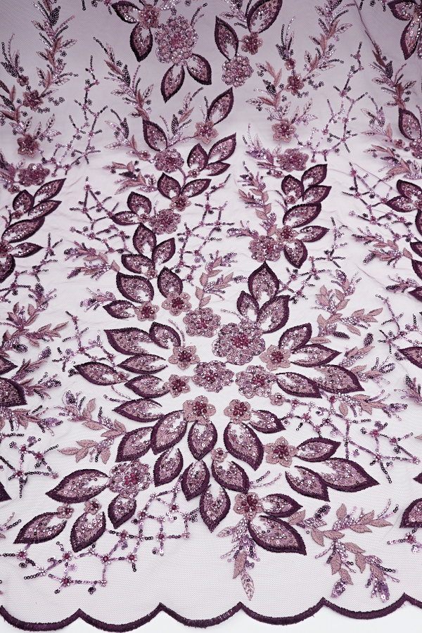 Tul bordado con lentejuelas y cuentas. Forma un patrón de celosía. Acabado en los laterales y con diferentes detalles de relleno de principio a fin. |