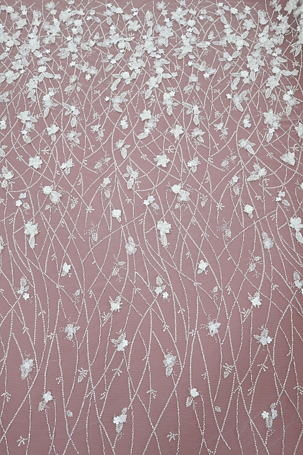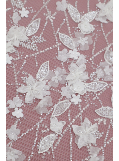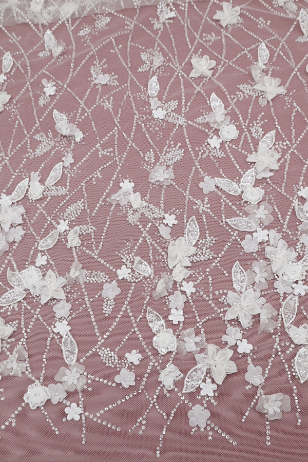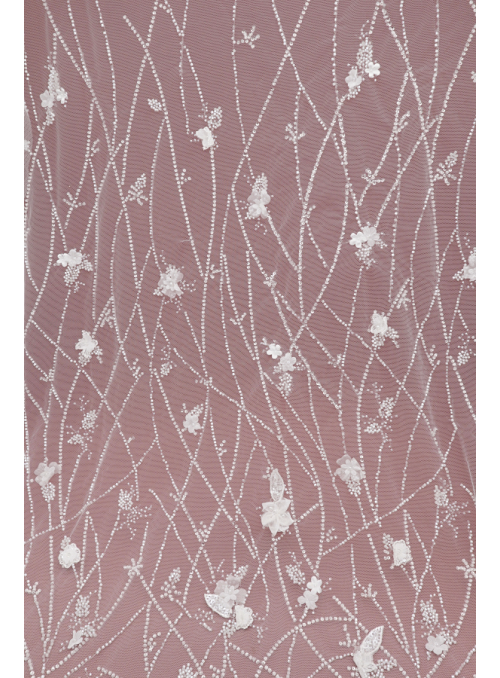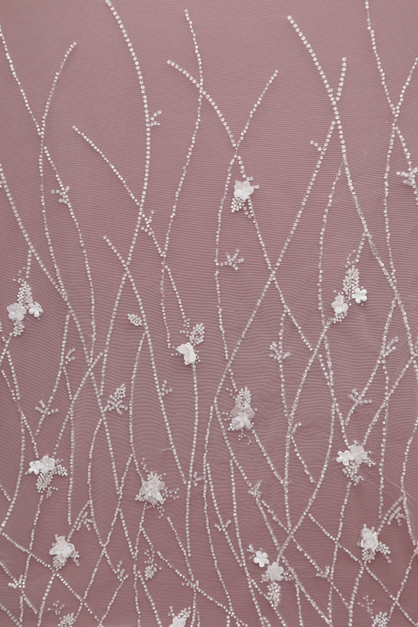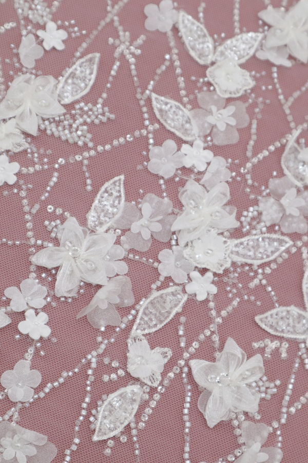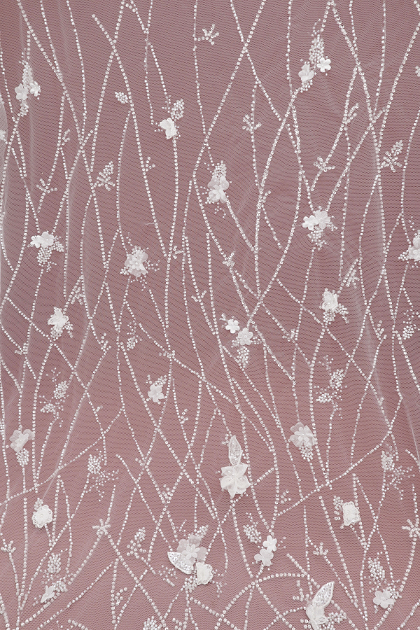 Tul bordado, adornado con pedrería, lentejuelas y flores 3D. Sin ribete. |