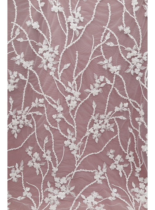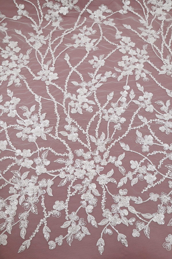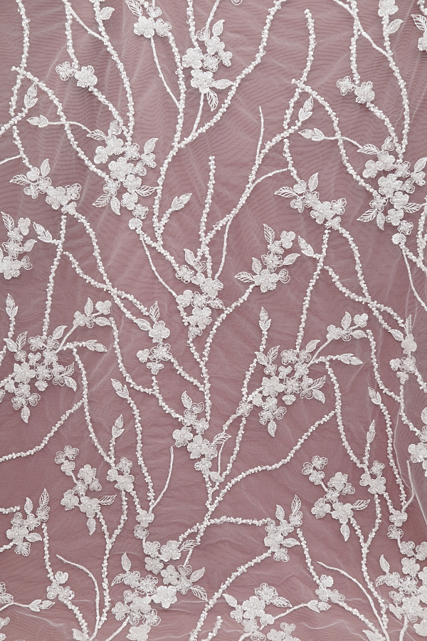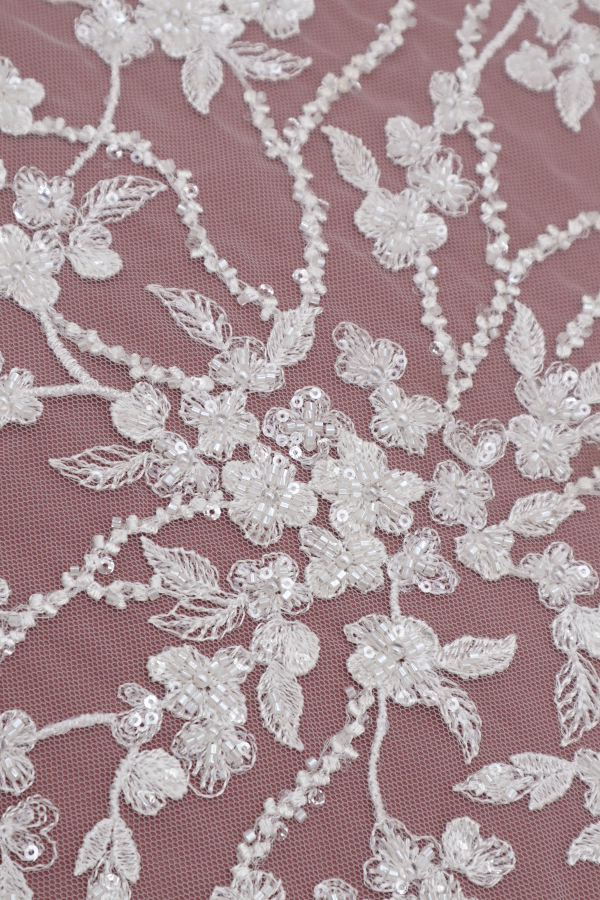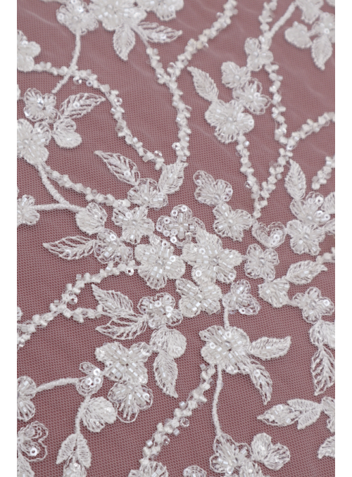 Tul bordado, adornado con pedrería y lentejuelas. Sin ribete. |
