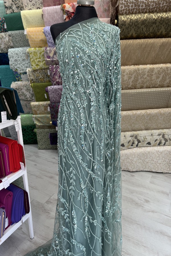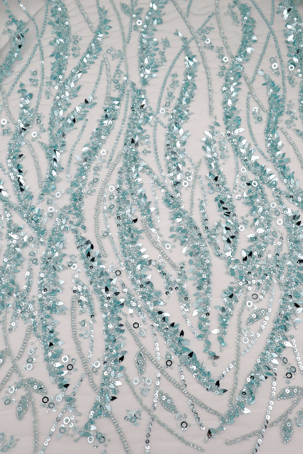 Tul bordado con lentejuelas y cuentas. Forma patrones con diferente relleno en cada lado. Sin remate en los bordes. |