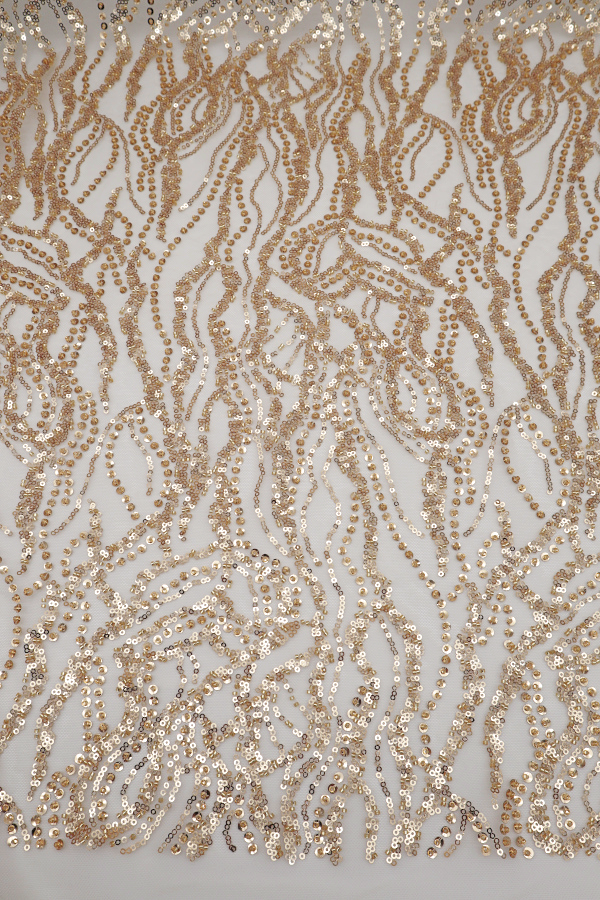 Tul bordado con lentejuelas y cuentas. Estas forman patrones por toda la tela con un relleno uniforme. Sin acabado en los laterales. |