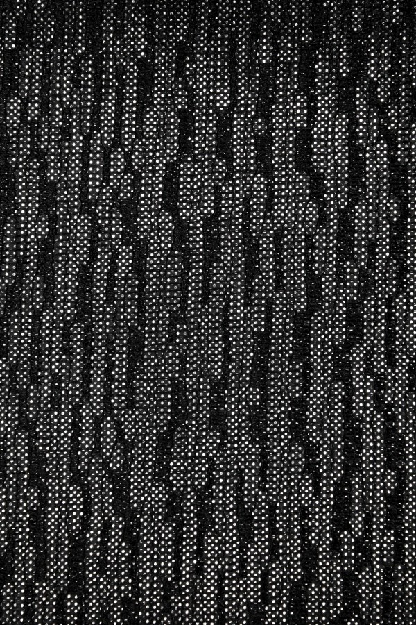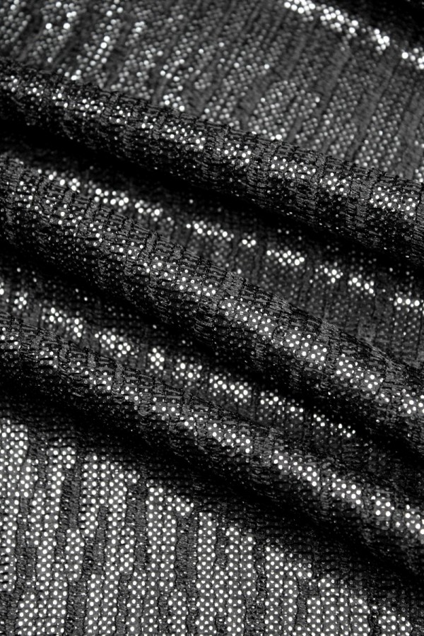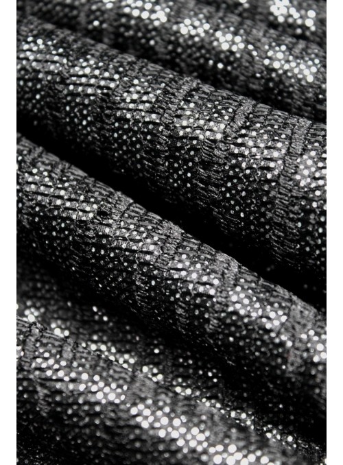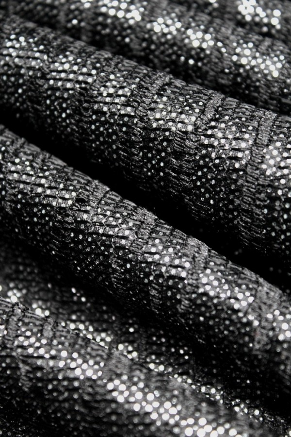 Tecido com estampado Foil metalizado de pontinhos. O tecido tem texturas e relevos contrastantes, é maleável e brilhante. |