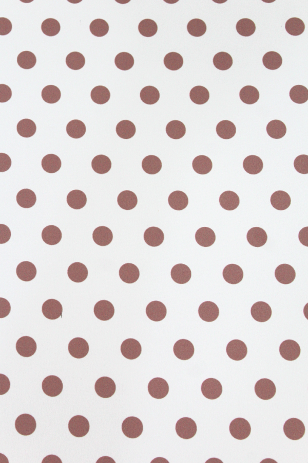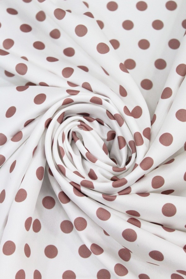 Seda crepe com estampado Polka dots (às bolas). Tecido leve, fino, fluído e lustroso, com toque muito agradável.