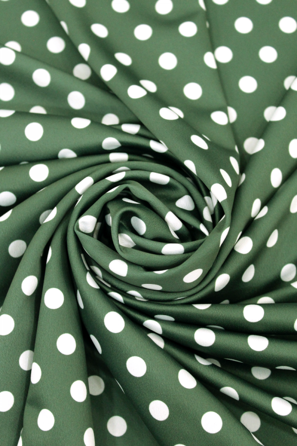 Seda crepe com estampado Polka dots (às bolas). Tecido leve, fino, fluído e lustroso, com toque muito agradável. |