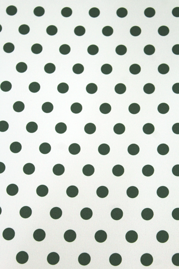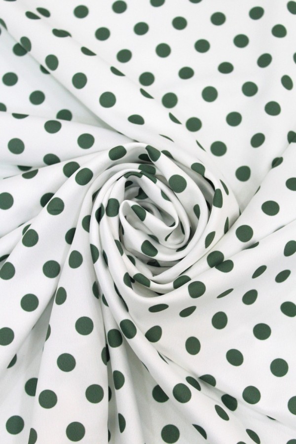 Seda crepe com estampado Polka dots (às bolas). Tecido leve, fino, fluído e lustroso, com toque muito agradável.