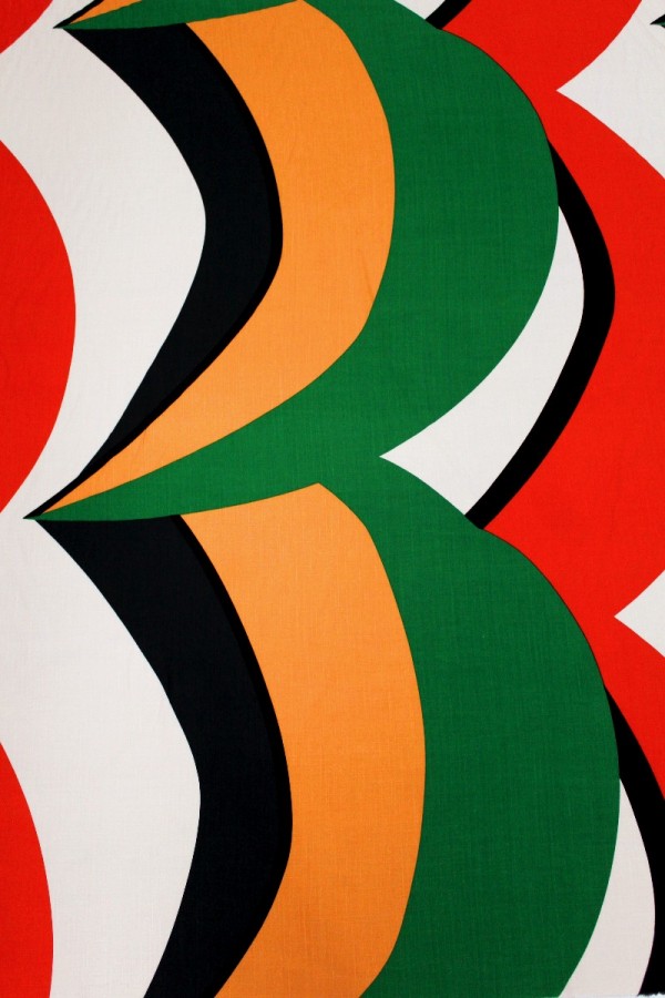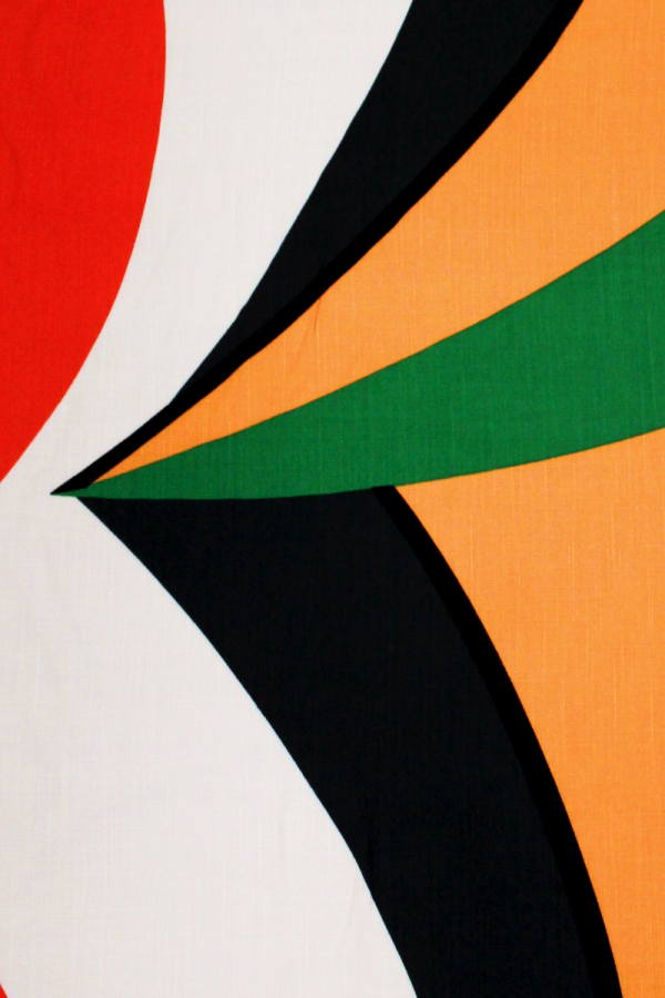 Tecido com estampado geométrico e abstrato, em grande escala. Leve, fino e fluído, com um toque macio e suave.