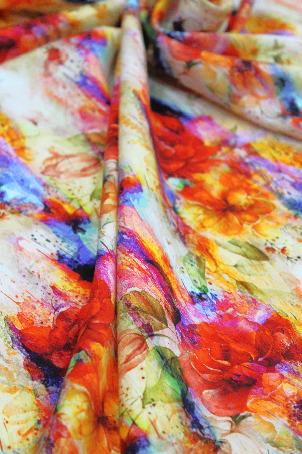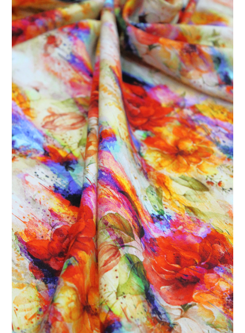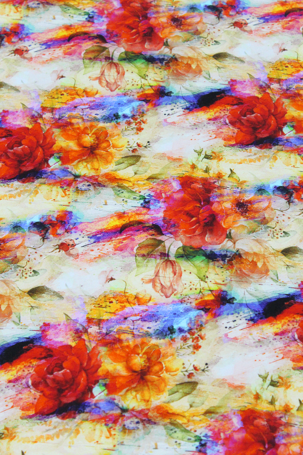 Tecido com estampado floral e abstrato. Leve, fino e fluído, com um toque macio e suave. |