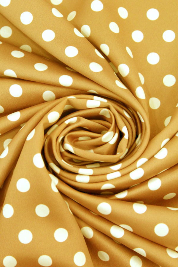 Seda crepe com estampado Polka dots (às bolas). Tecido leve, fino, fluído e lustroso, com toque muito agradável. |