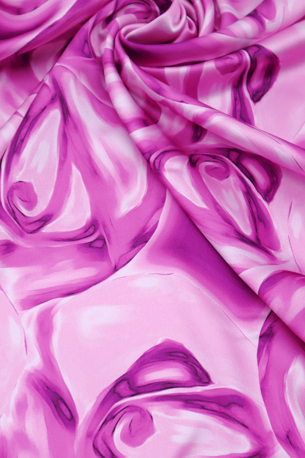 Tecido toque de seda estampado, leve, fino e fluído. |
