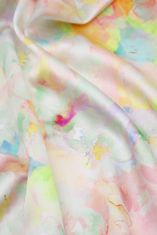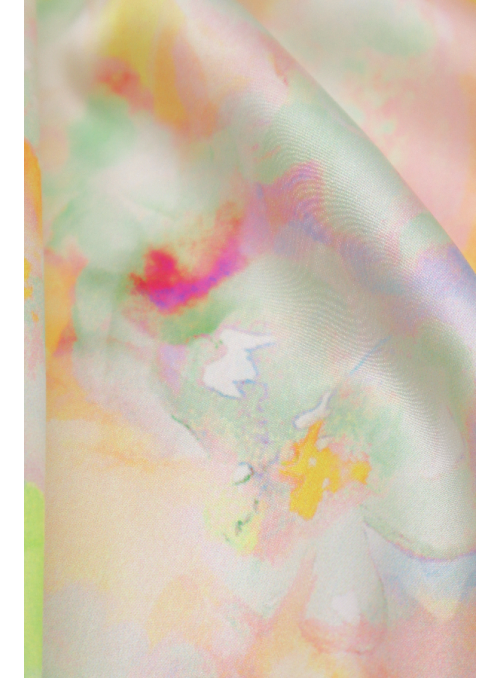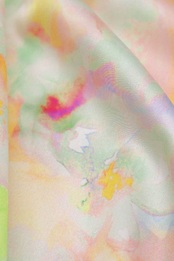 Tecido com toque de seda estampado, acetinado, leve, fino e fluído. |