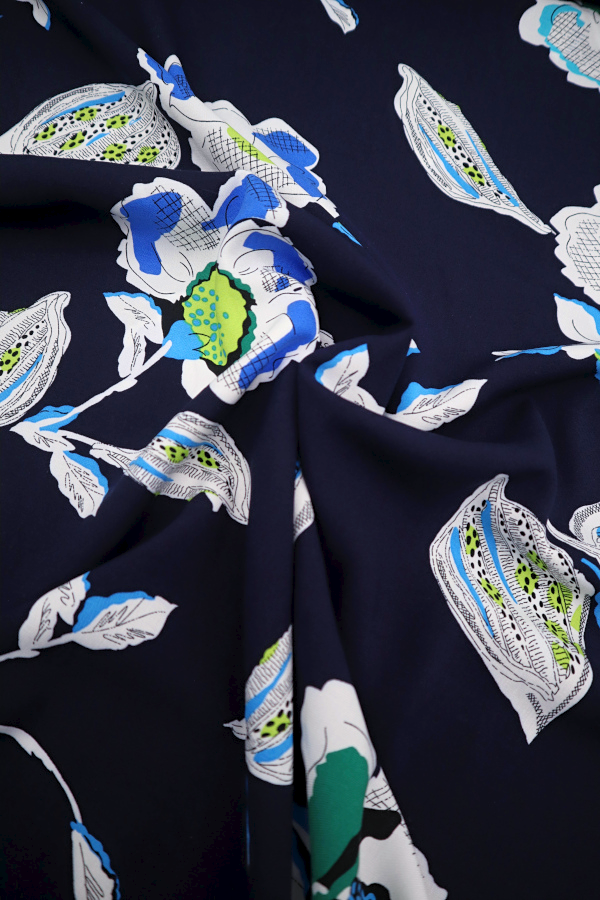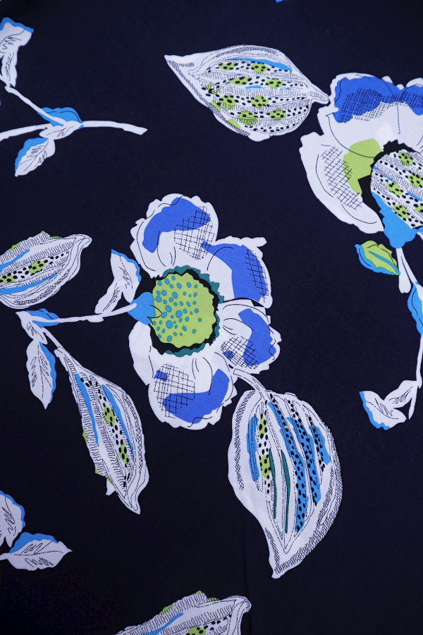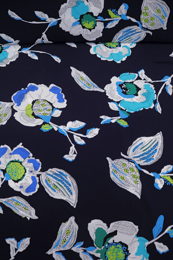 Fondo azul marino y flores en tonos azules y blancos. |