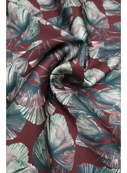 Fondo burdeos y hojas en tonos verdes. |
