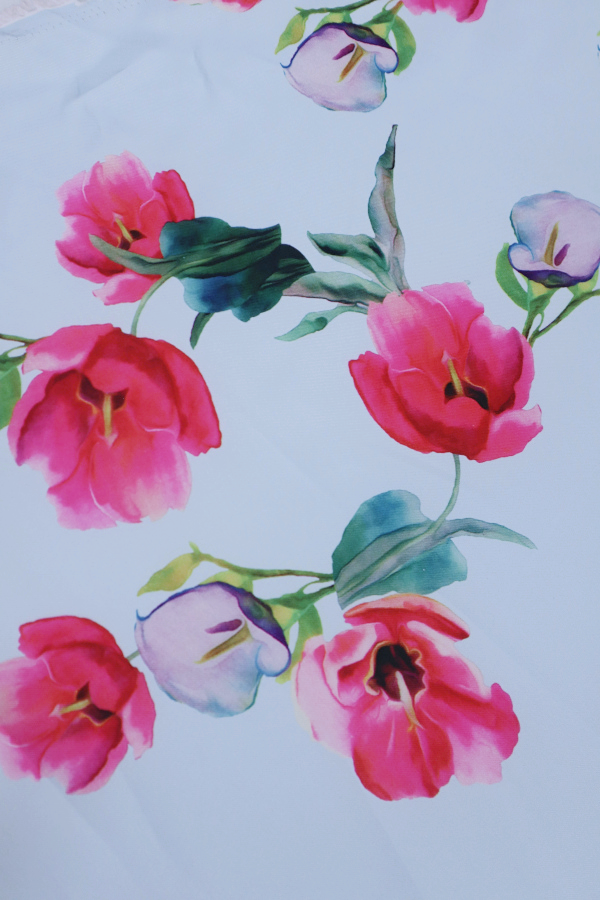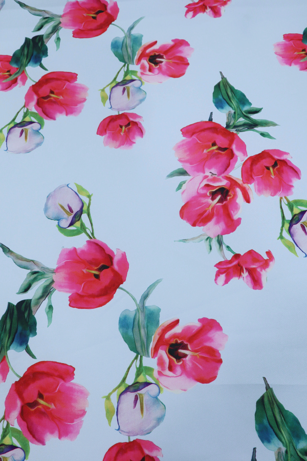 Fondo azul claro y flores en tonos rosas. |