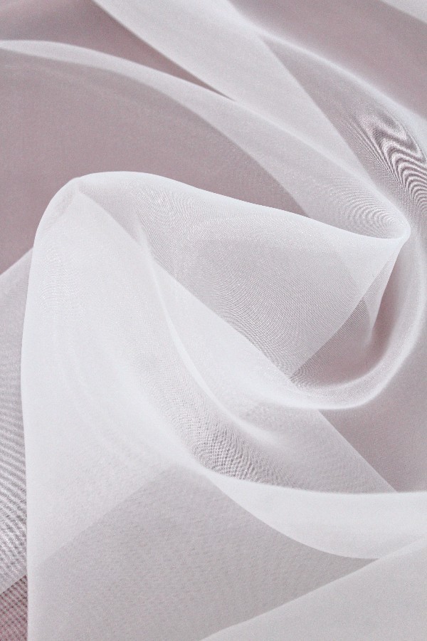 Tecido leve, fino, sedoso, arma e tem transparência. |