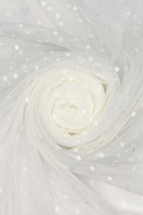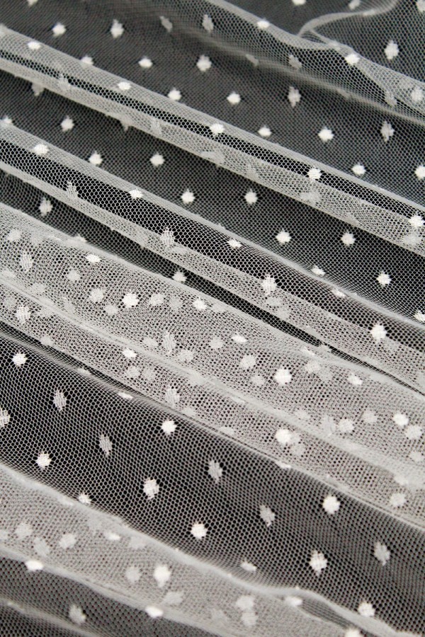 Tule Point d'esprit (às bolinhas), fino, leve e elástico, com toque suave. Muito maleável e delicado. |