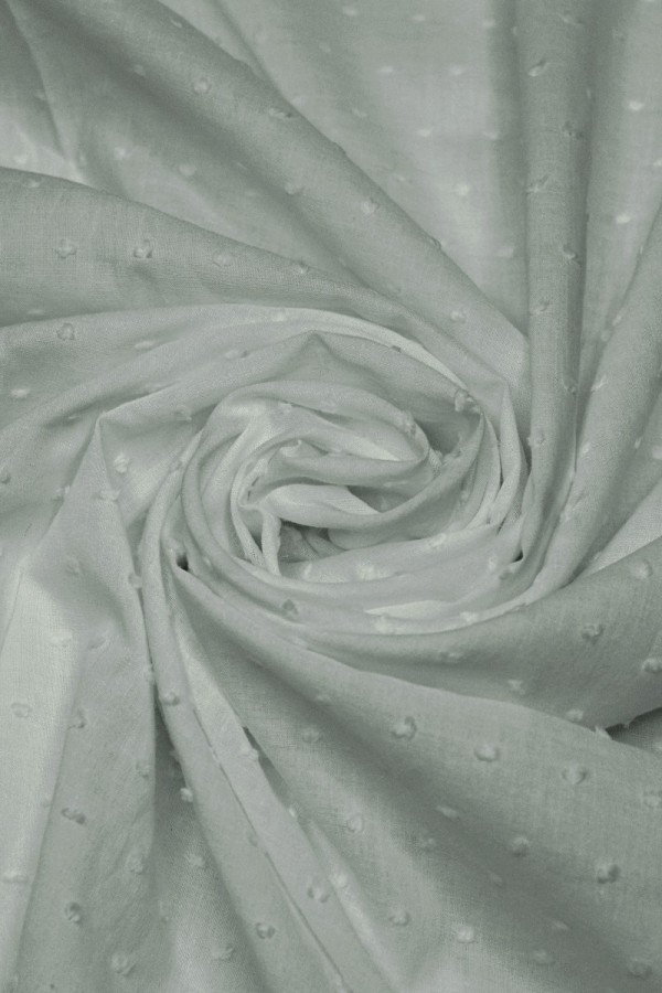 Tecido leve e macio, com pequenos motivos em relevo. Cai bem, é fino e ligeiramente transparente. |