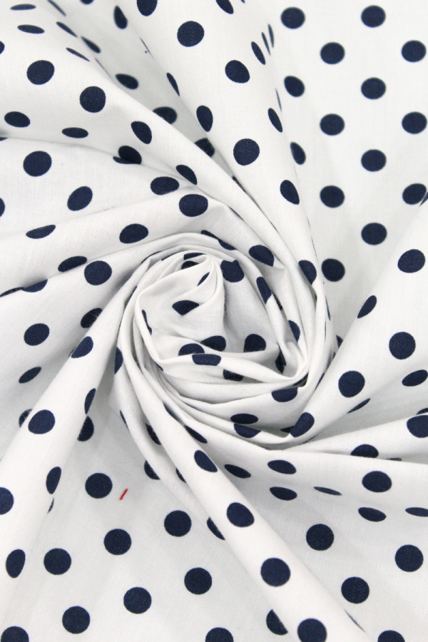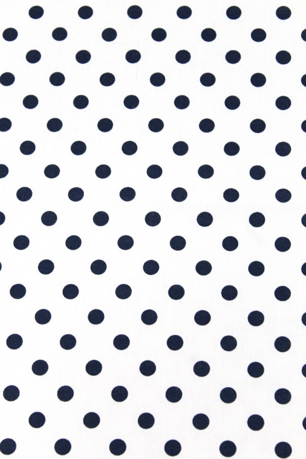 Tecido com estampado Polka dots (às bolas). Agradável ao toque e resistente, com uma ligeira transparência. |