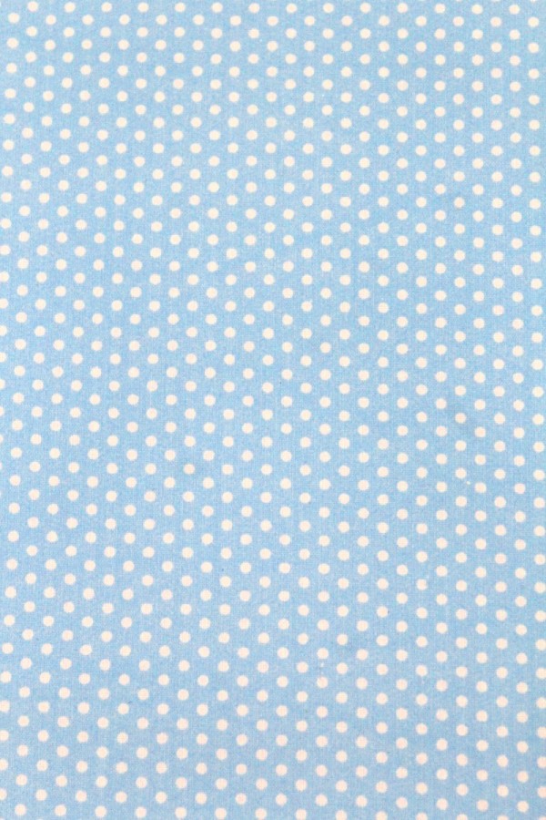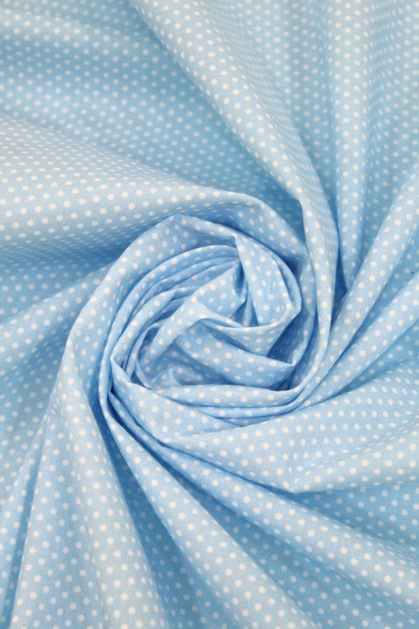 Tecido com estampado Polka dots (às pintinhas). Agradável ao toque e resistente, com uma ligeira transparência.