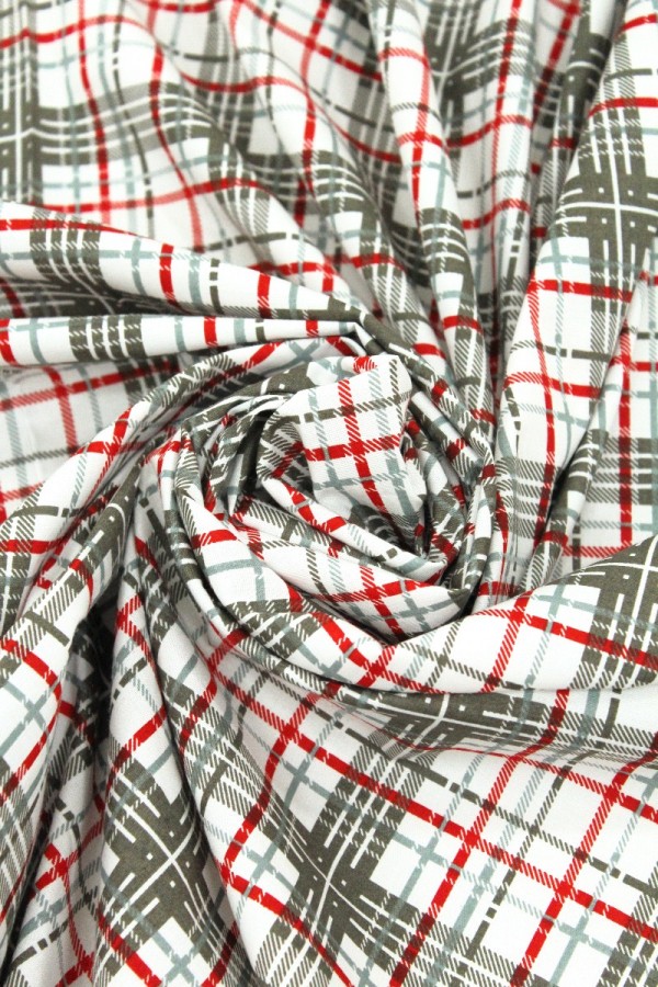 Tecido estampado e macio ao toque, com elasticidade, ligeiramente transparente.