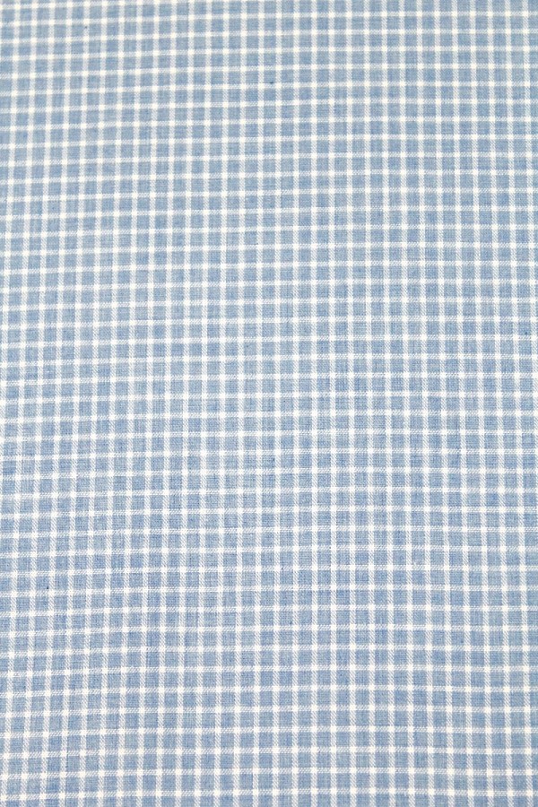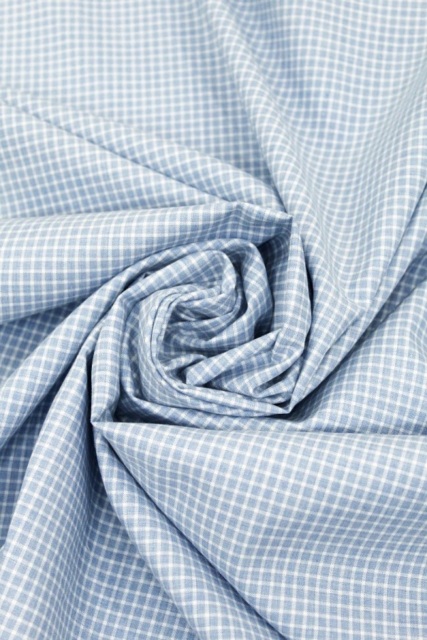 Tecido com padrão xadrez em pequena escala, macio ao toque e resistente. |