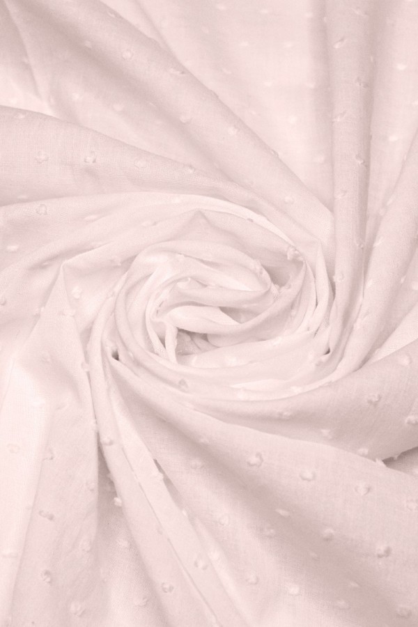 Tecido leve e macio, com pequenos motivos em relevo. Cai bem, é fino e ligeiramente transparente. |