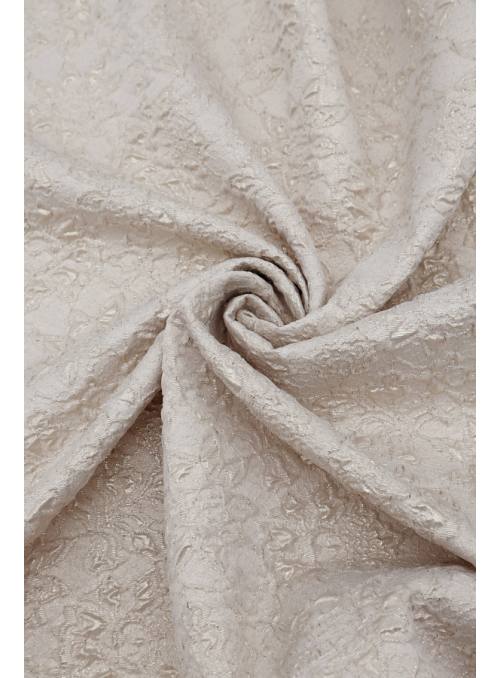Tecido que arma, com desenho em leve relevo e agradável ao toque. Com fios de lurex dourado, com brilho.  |