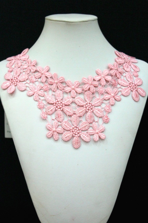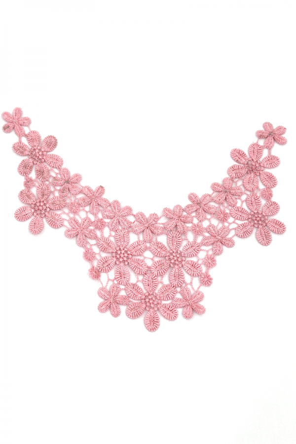 Aplicação do tipo renda Guipure, leve e agradável ao toque, com algum lustro. |