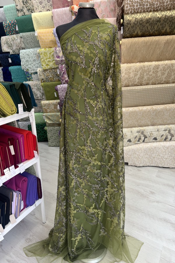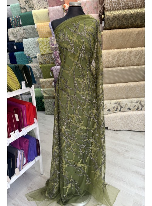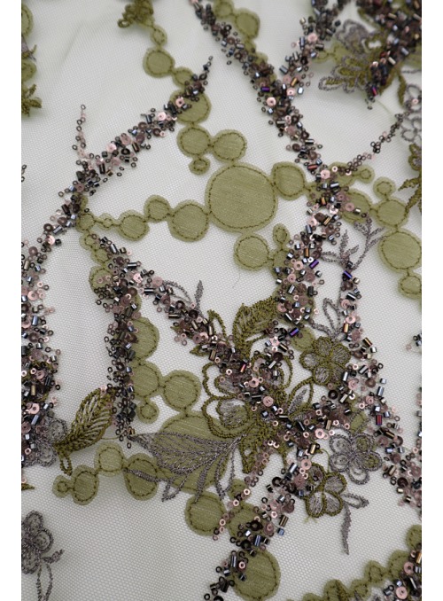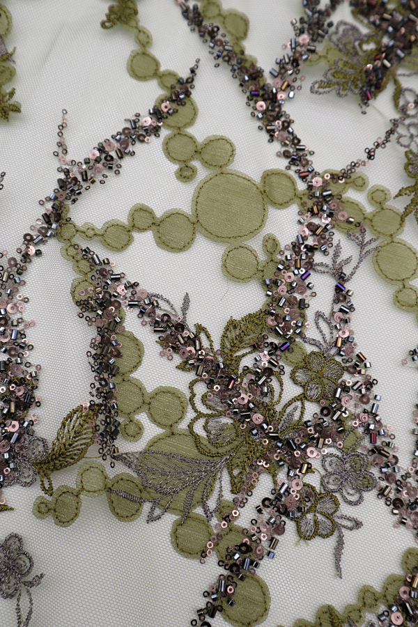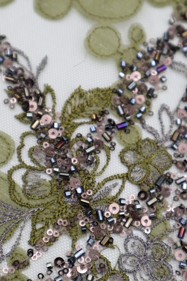 Tule bordado com lantejoulas e missangas. Formam rameados e com preenchimento diferente de um lado e do outro. Sem remate nos lados. |