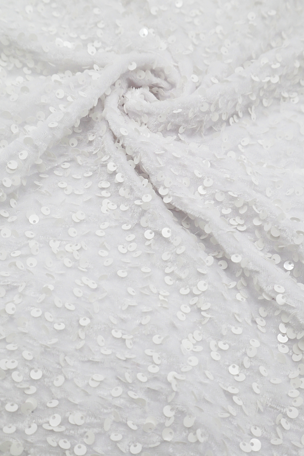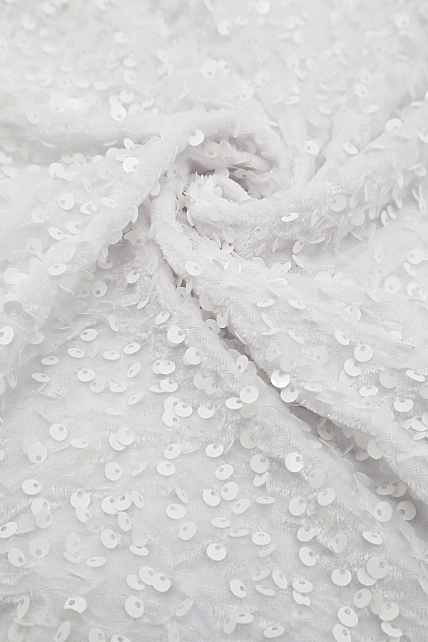 Veludo com elasticidade e ótimo cair, maleável, suave ao toque, lustroso e com aplicações de lantejoulas. |